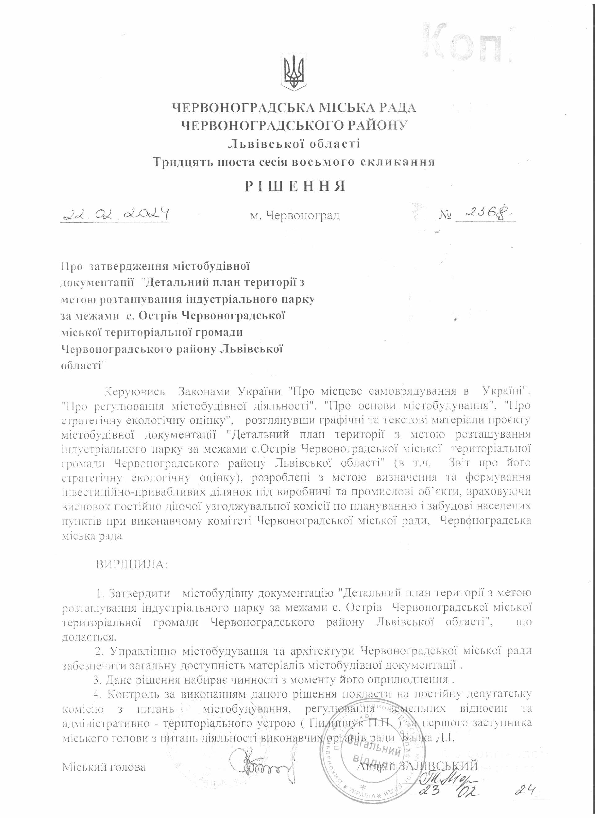 Детальний план території з метою розташування індустріального парку за межами с. Острів Червоноградської міської територіальної громади Червоноградського району Львівської області. затверджений рішенням Червоноградської міської ради від 22.02.2024 № 2368