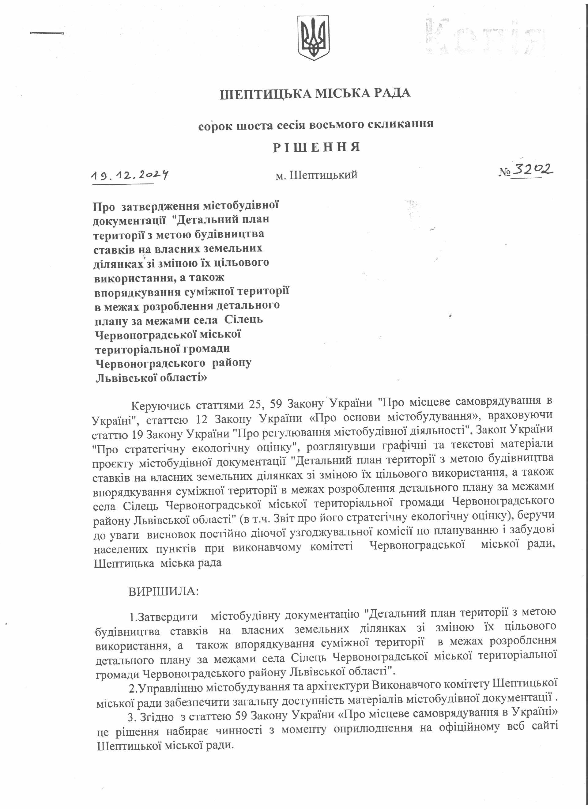 "Детальний план території з метою будівництва ставків на власних земельних ділянках зі зміною їх цільового використання, а також впорядкування суміжної території в межах розроблення детального плану за межами села Сілець Червоноградської міської територіальної громади Червоноградського району Львівської областіі" затверджено рішенням Шептицької міської ради від 19.12.2024 № 3202