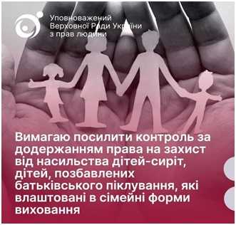 Уповноважений Верховної Ради України з прав людини звернулась до Національної соціальної сервісної служби з вимогою посилити контроль за додержанням права на захист від насильства дітей-сиріт, дітей, позбавлених батьківського піклування, які влаштовані в сімейні форми виховання, та забезпечити якісне супроводження прийомних сімей та дитячих будинків сімейного типу, нагляд за дотриманням прав усиновлених дітей.