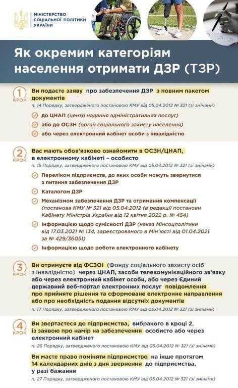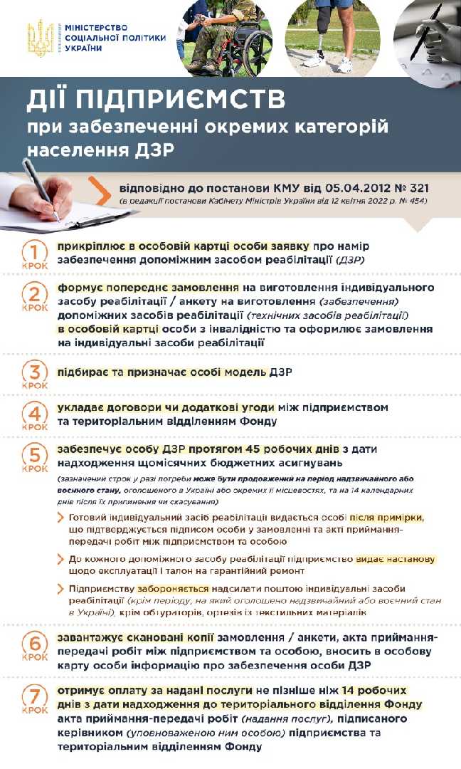 З 19 квітня 2022 року набрали чинності зміни, внесені до оновленого Порядку забезпечення допоміжними засобами реабілітації (технічними та іншими засобами реабілітації) осіб з інвалідністю, дітей з інвалідністю та інших окремих категорій населення і виплати грошової компенсації вартості за самостійно придбані такі засоби, затвердженого ПКМУ №321 від 05.04.2012р, якими передбачено механізм забезпечення допоміжними засобами реабілітації людей, постраждалих внаслідок війни Росії проти України, як військовослужбовців Збройних сил України та інших військових формувань, так і добровольців територіальної оборони, і мирних громадян.