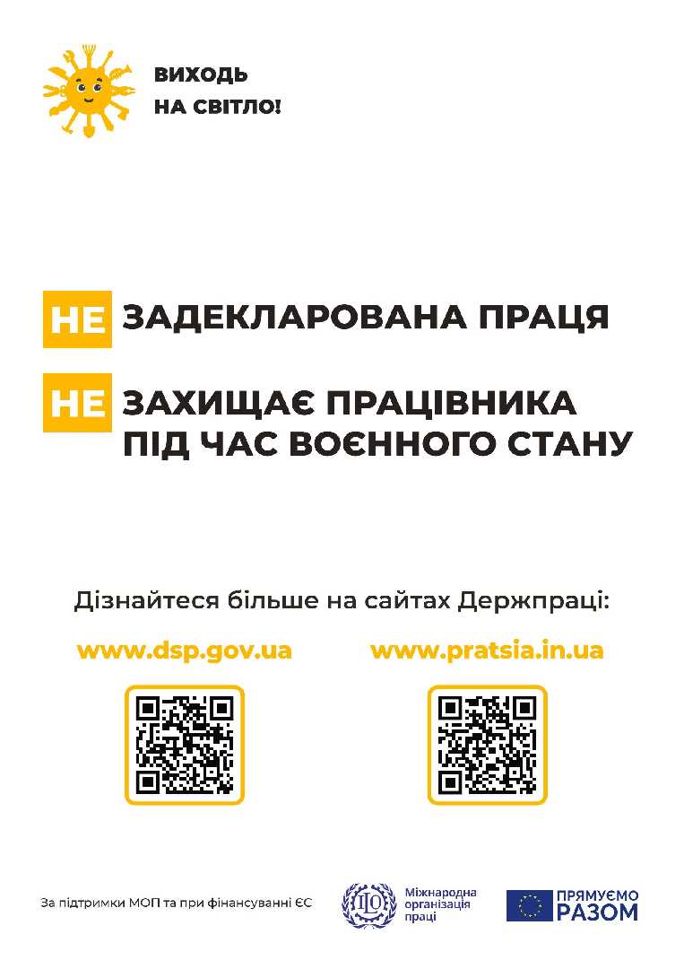 Пам’ятайте! Тільки задекларована праця забезпечує стабільність і захист для працівників, сприяє розвитку економіки та підвищує обороноздатність нашої країни. Кожен з нас може зробити свій внесок у зміцнення нашої держави, працюючи легально і відповідально. Тільки разом ми зможемо побудувати сильну, незалежну та процвітаючу Україну!