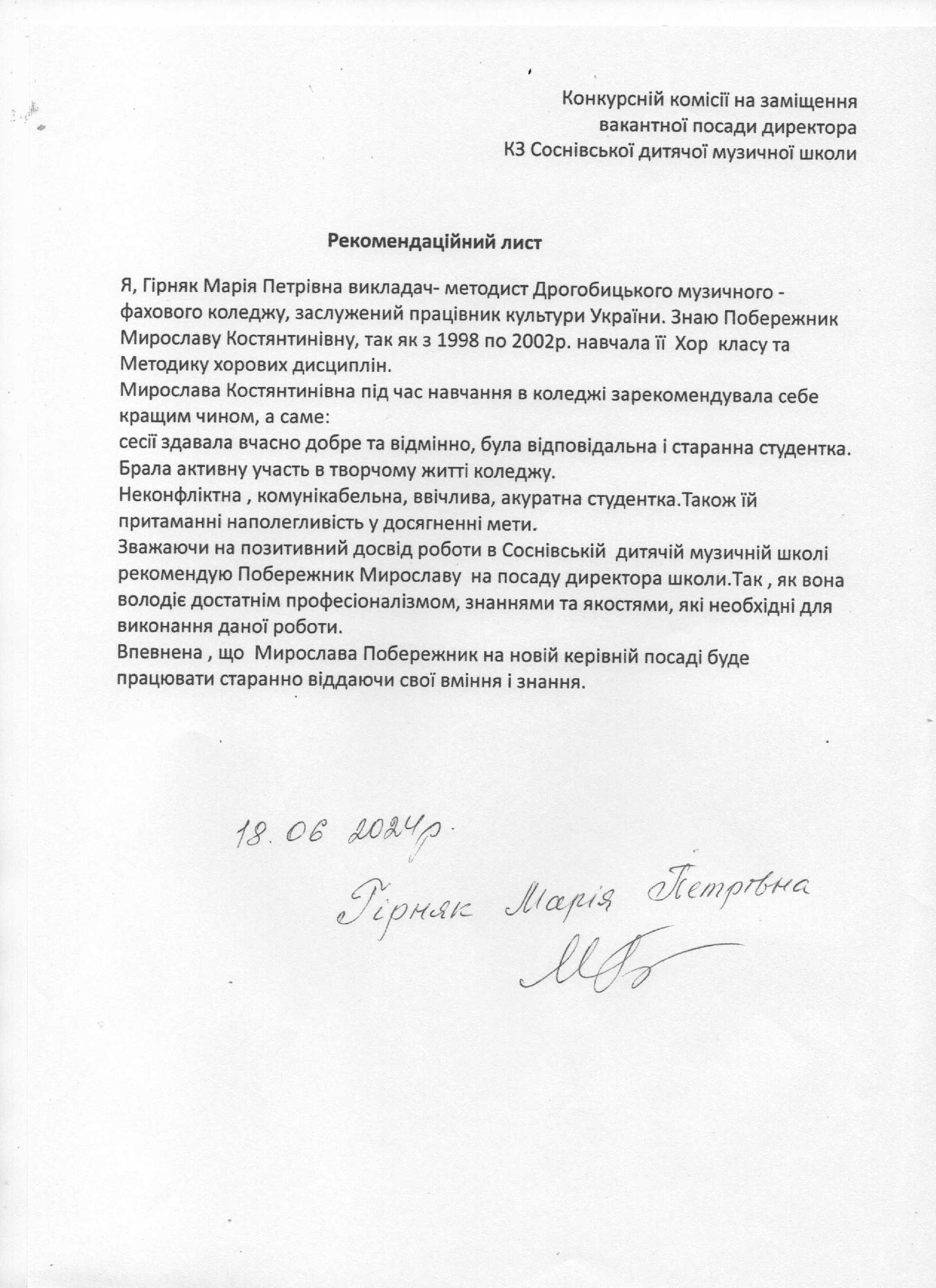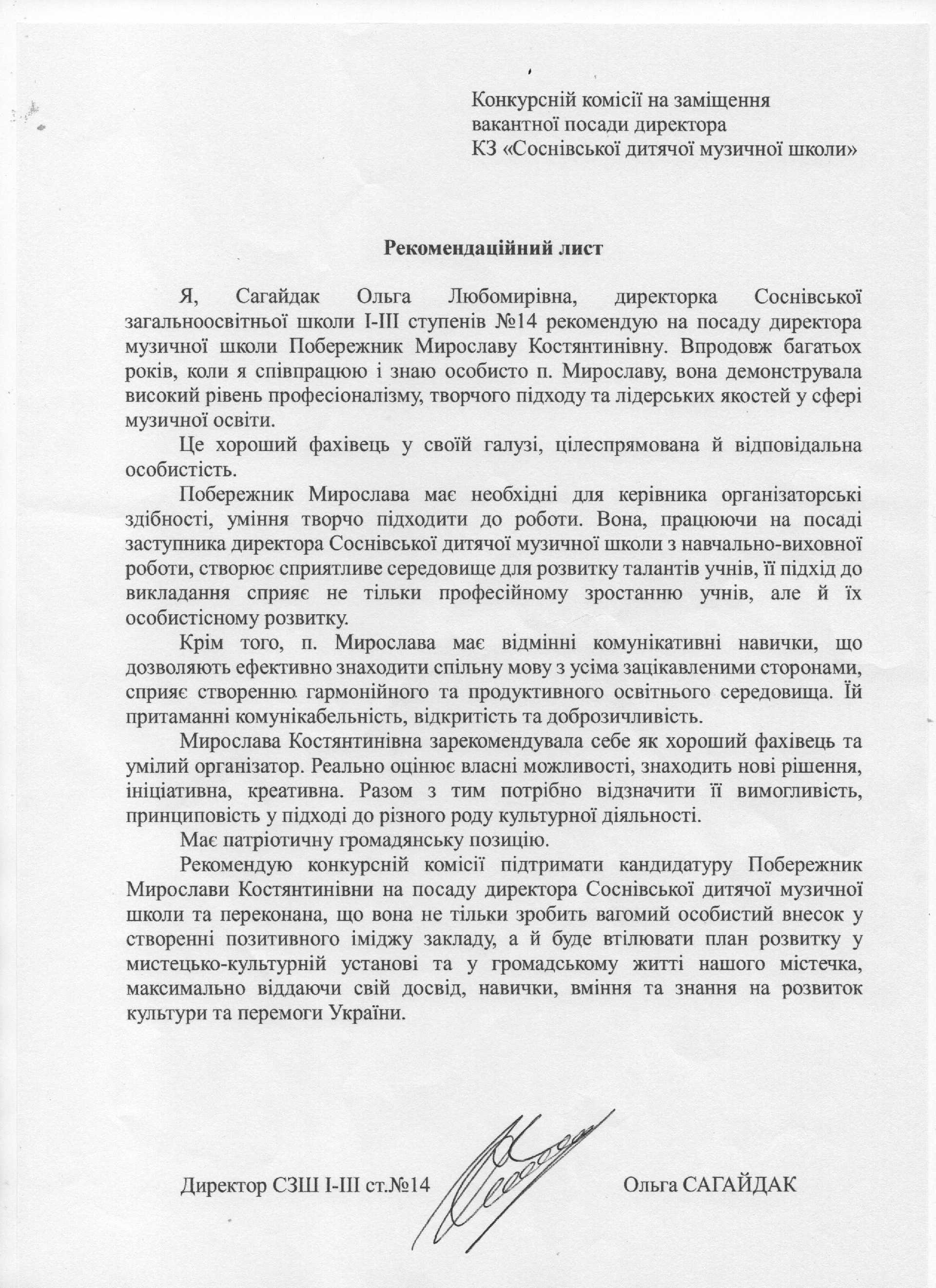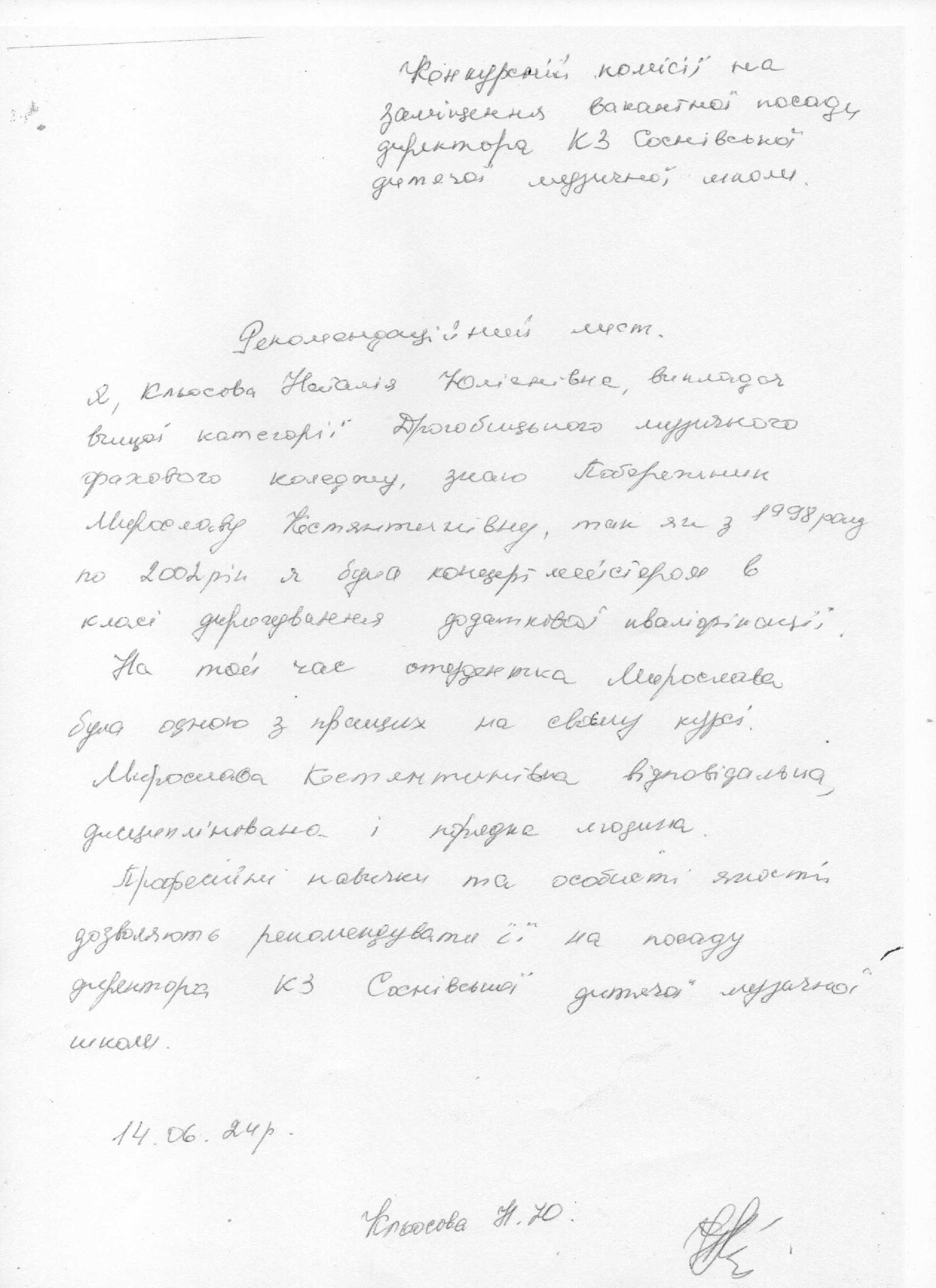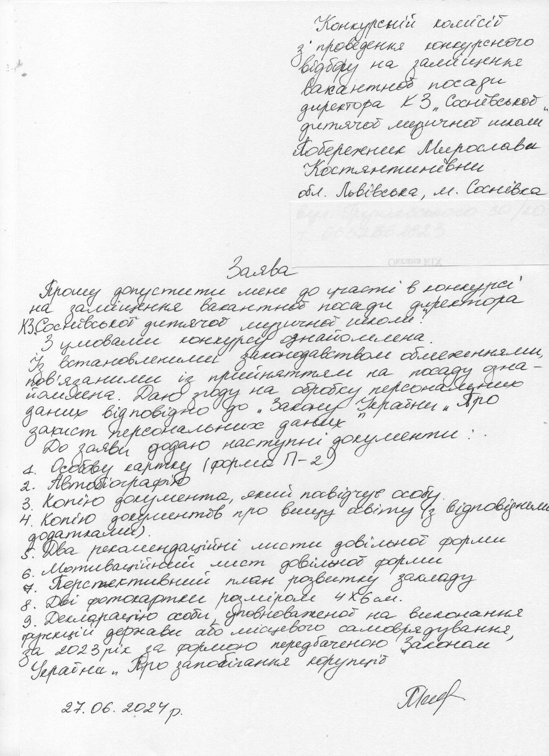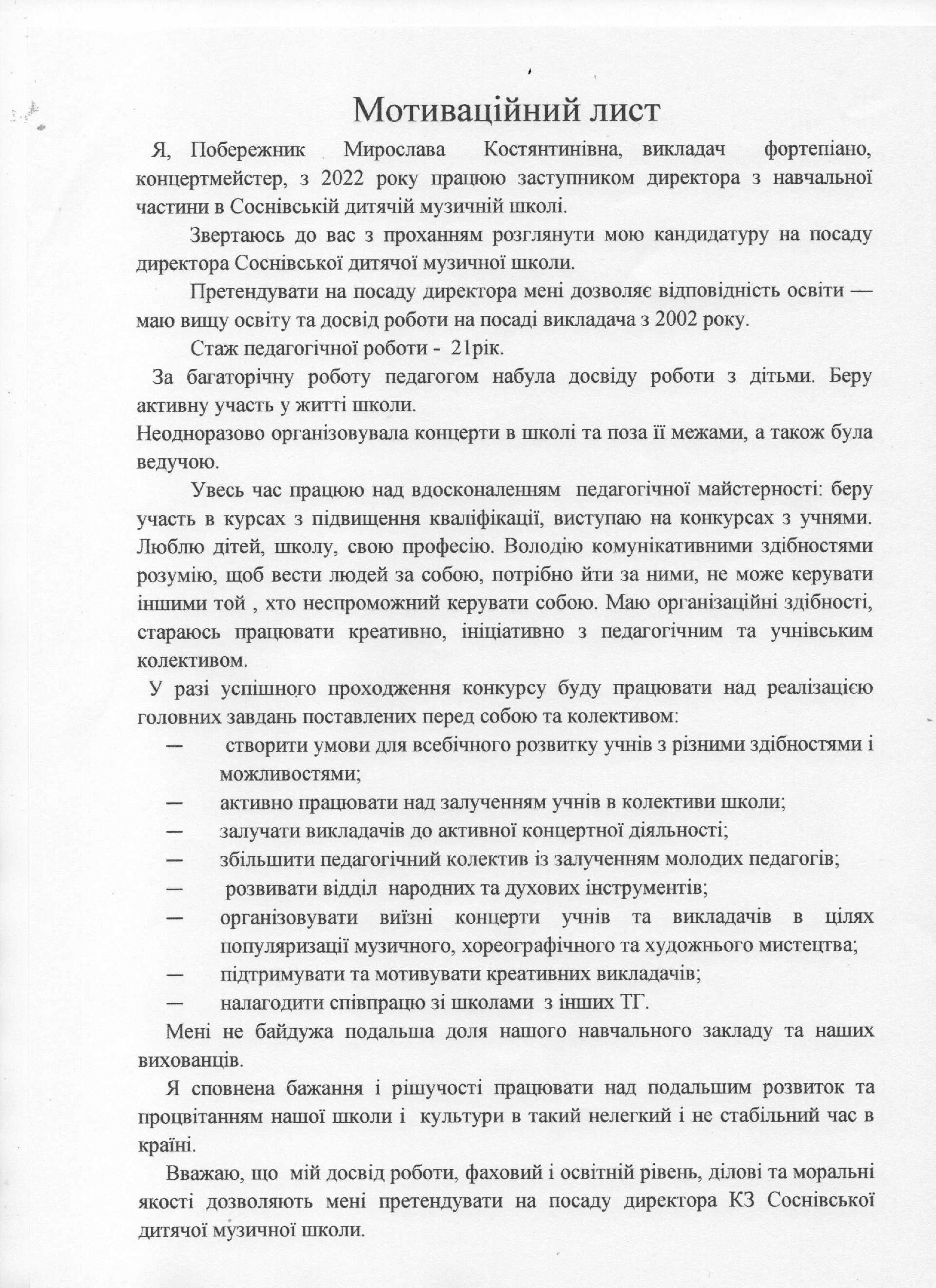 Згідно п.6.4, висвітлено подані документи претендента на посаду директора КЗ «Соснівська дитяча музична школа»: