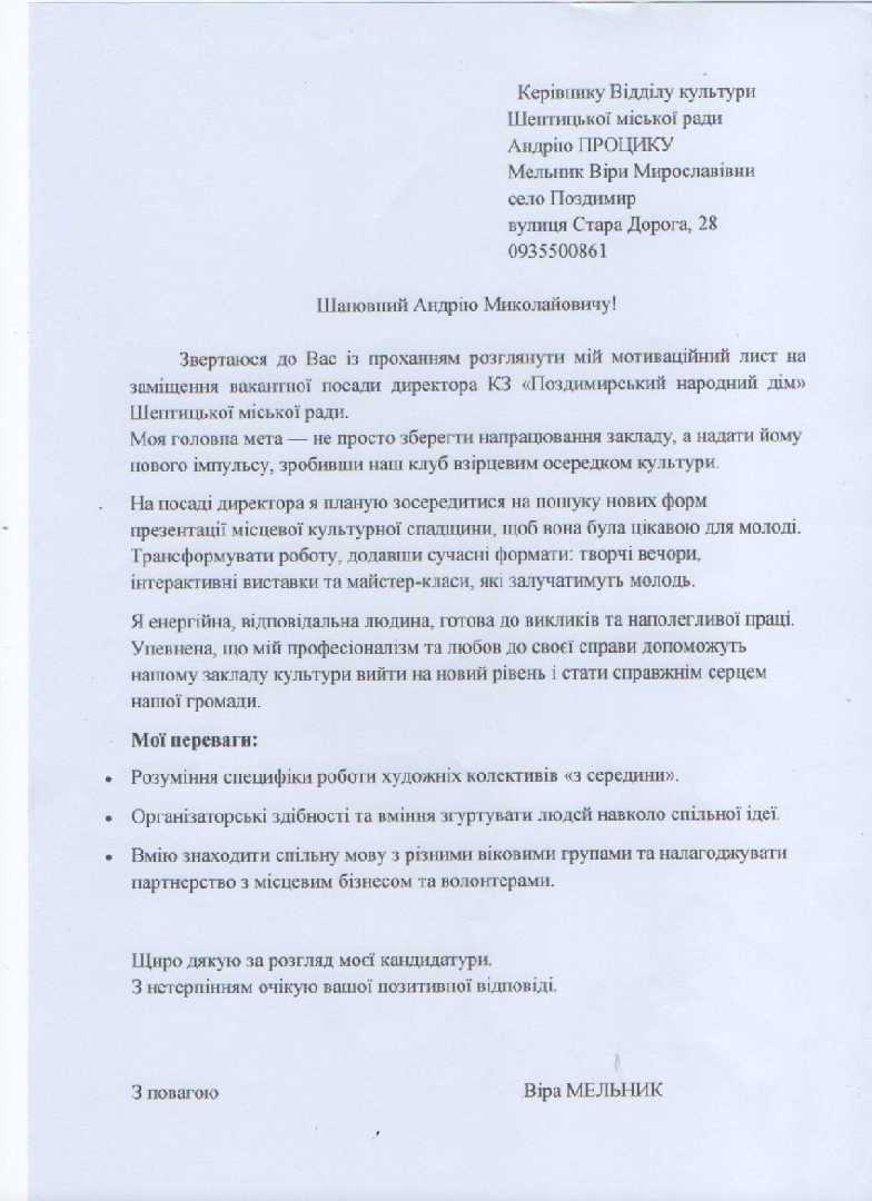 Відповідно до Закону України «Про внесення змін до деяких законодавчих актів України щодо запровадження контрактної форми роботи у сфері культури та конкурсної процедури призначення керівників державних та комунальних закладів культури» та Порядку призначення на посаду керівників закладів культури Червоноградської міської ради Львівської області за результатами конкурсного відбору, затвердженого рішенням сесії Червоноградської міської ради від 03.03.2016 №93, п.6.4 висвітлено подані документи претендента на посаду директора КЗ «Поздимирський народний дім» - Мельник Віри Мирославівни.
