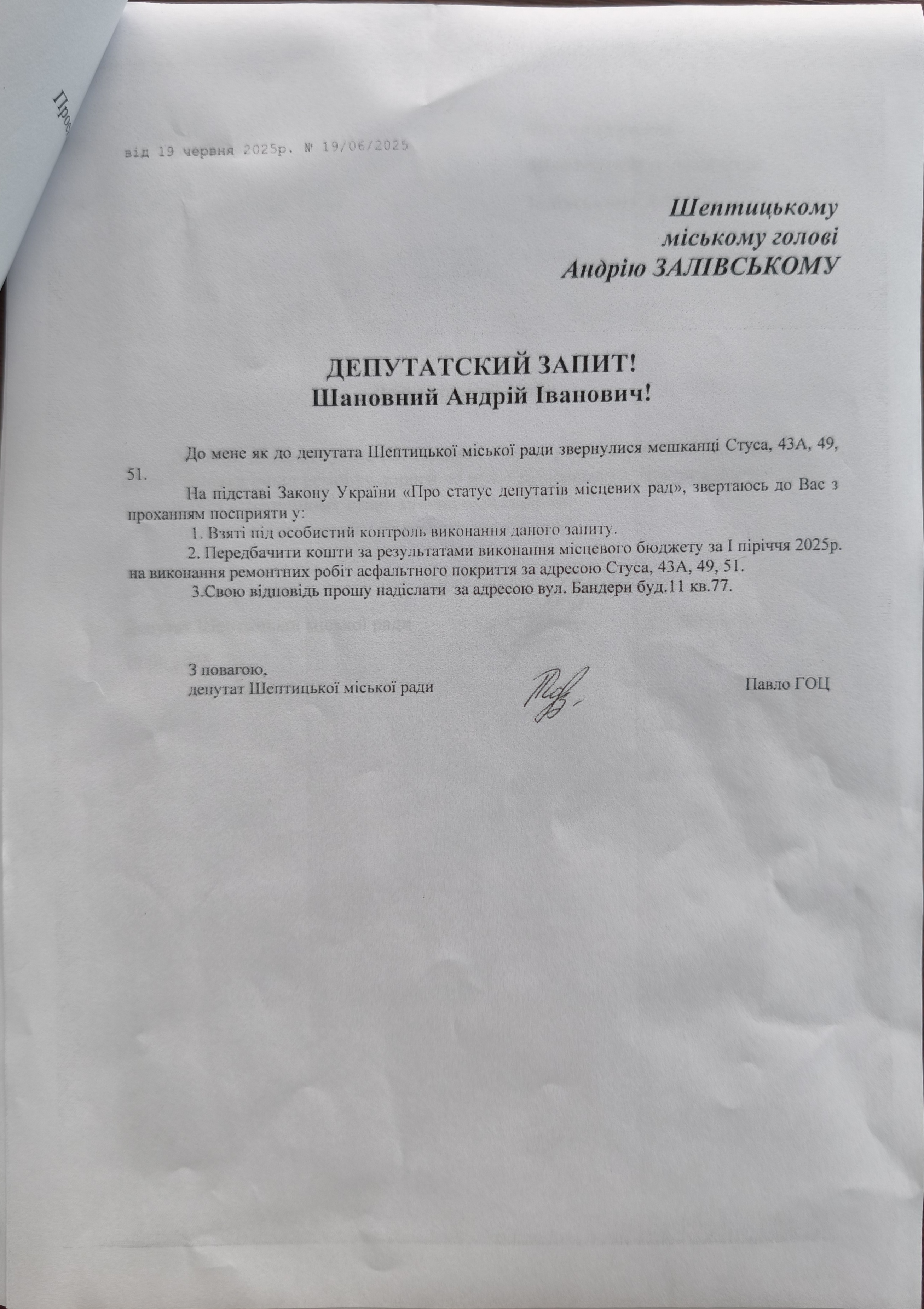 Заслухавши запит депутатiв мiської ради та вiдповiдно до частини сьомої статтi 49 Закону України «Про мiсцеве самоврядування в Українi», статей 21, 22 Закону України «Про статус депутатiв мiсцевих рад» Шептицька мiська рада,