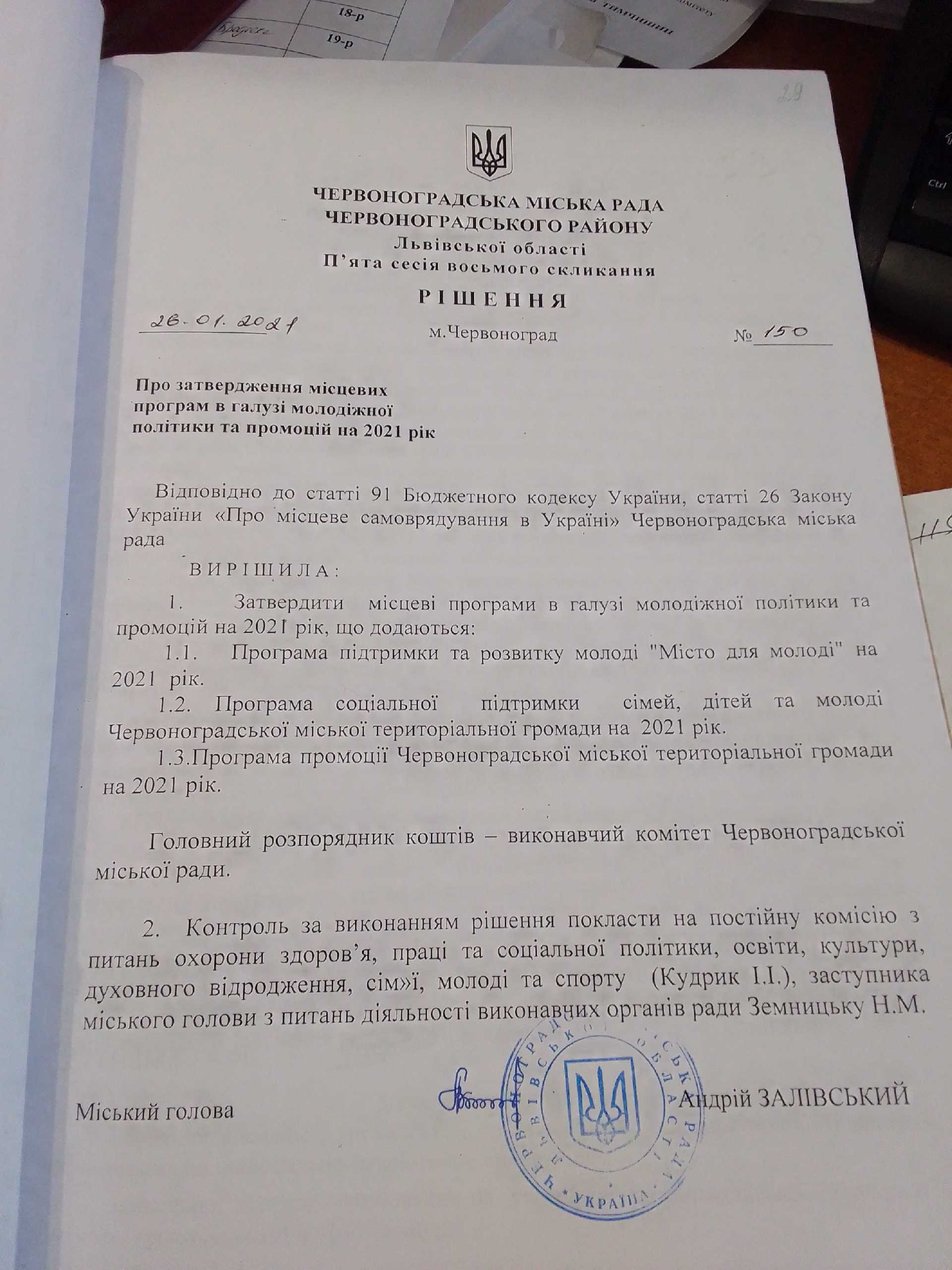 Про затвердження місцевих програм в галузі молодіжної політики та промоцій на 2021 рік