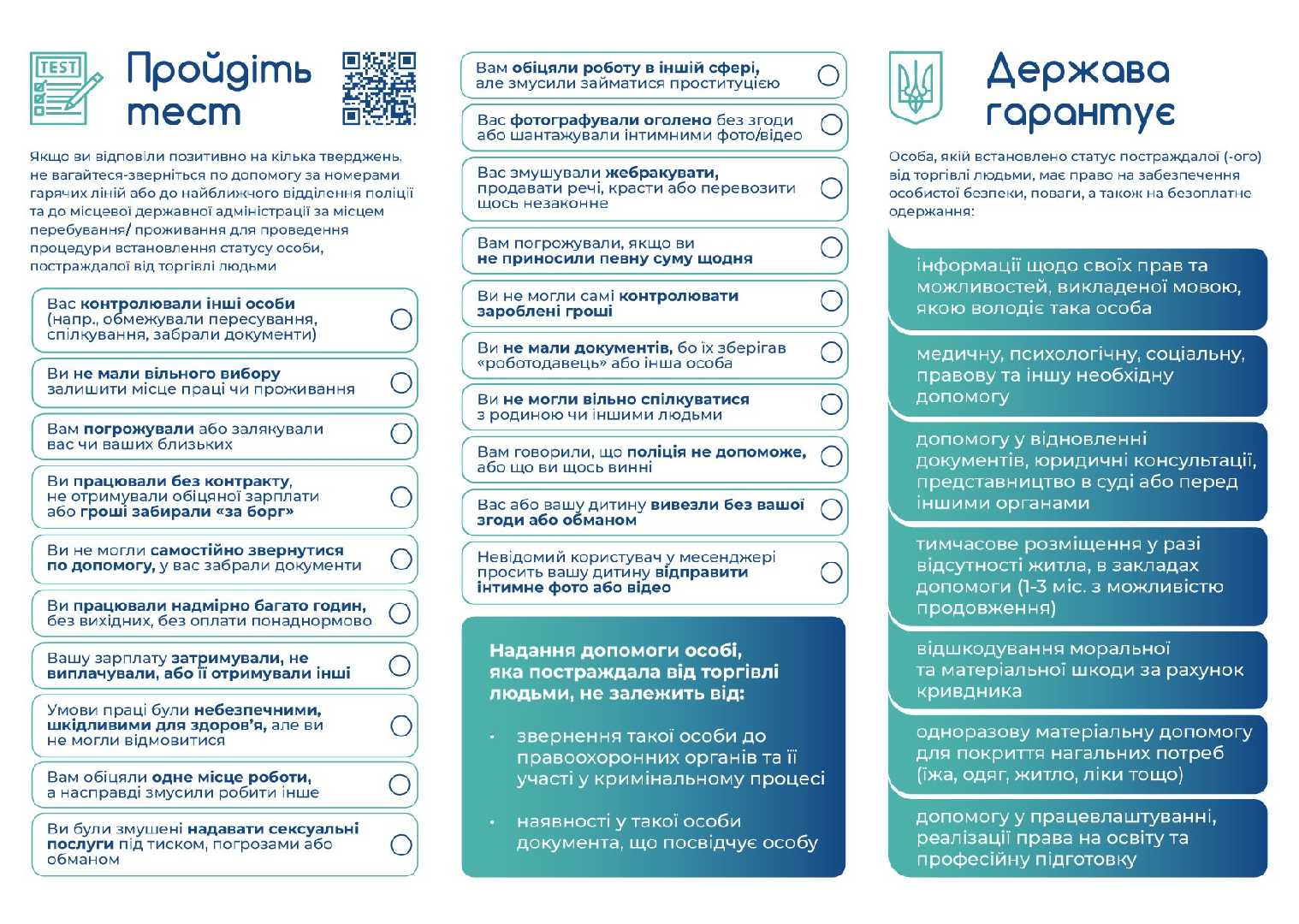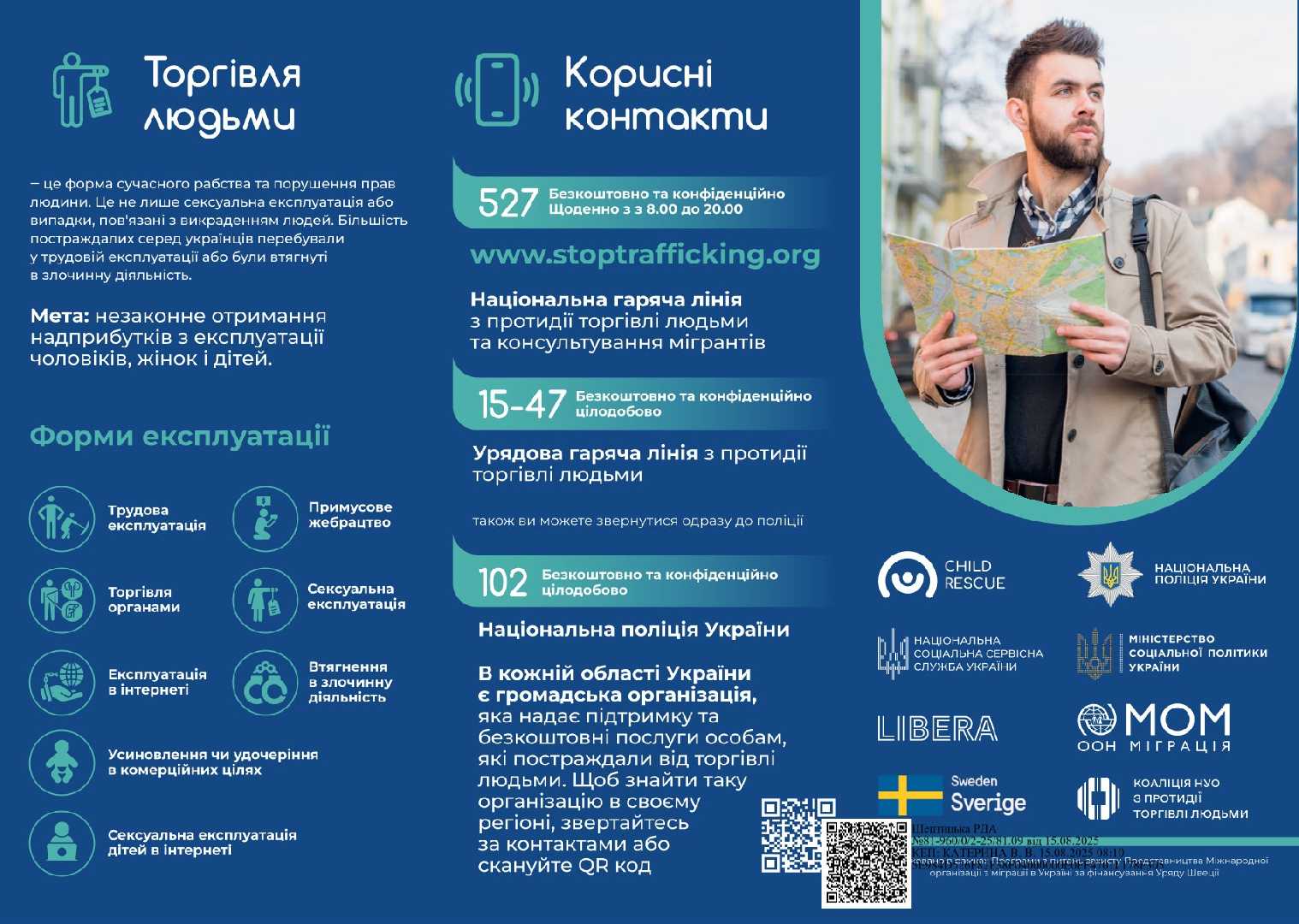 Національна безкоштовна ’’гаряча’’ лінія з питань протидії торгівлі людьми та консультування мігрантів: 0 800 505 501 (зі стаціонарного телефону) та безкоштовний короткий номер 527 (з мобільного телефону)