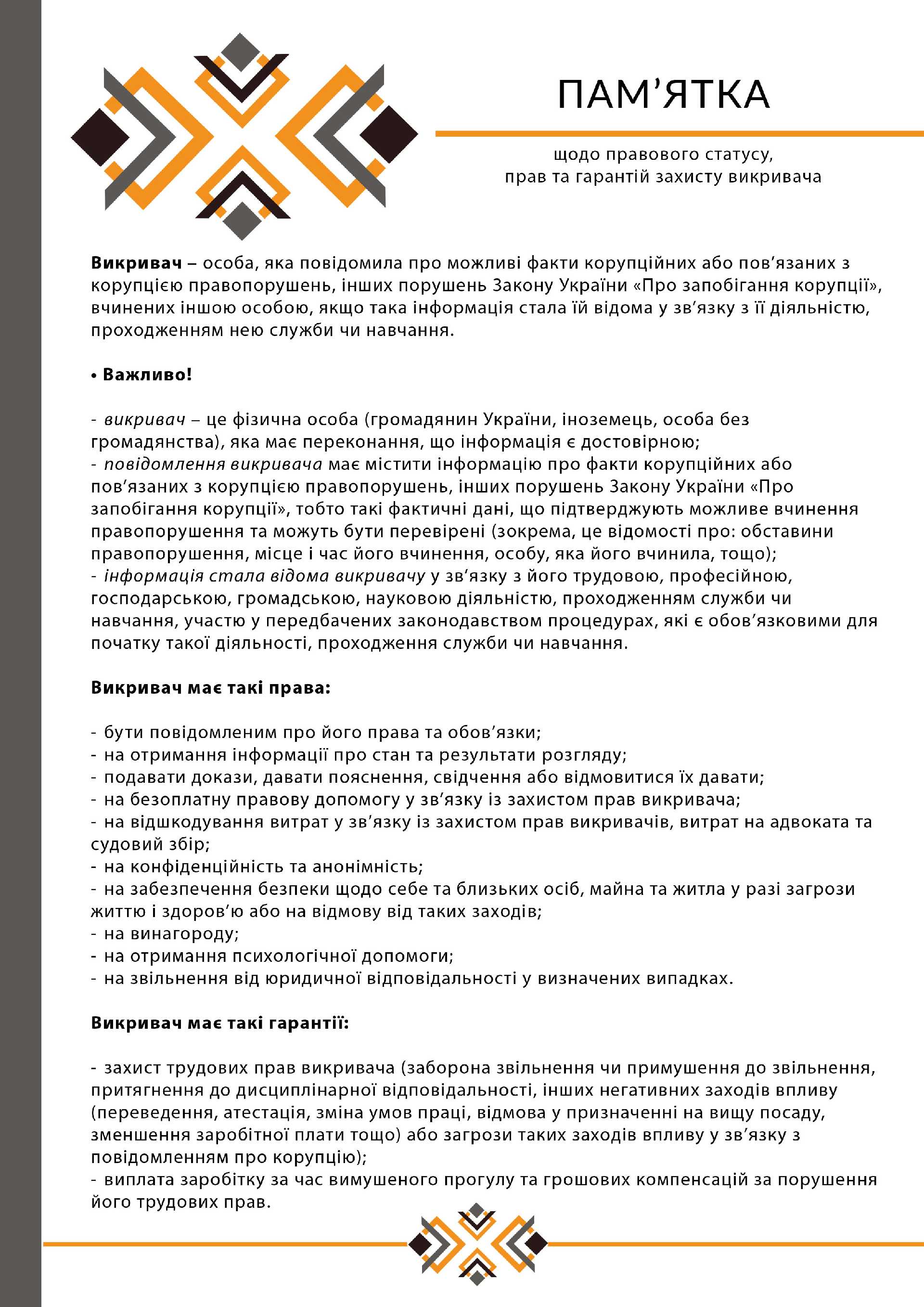 - Національного агентства з питань запобігання корупції (для забезпечення правового та іншого захисту, перевірки дотримання законодавства з питань захисту викривачів, внесення приписів з вимогою про усунення порушень трудових та інших прав викривача і притягнення до відповідальності осіб, винних у порушенні їхніх прав, у зв’язку з такими повідомленнями);