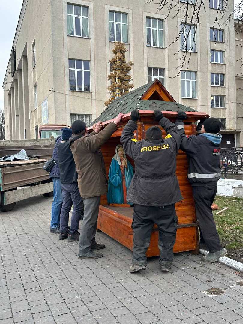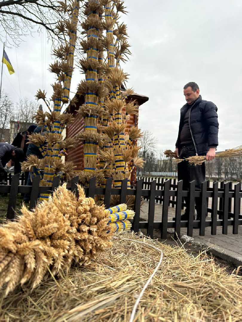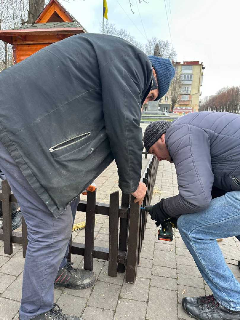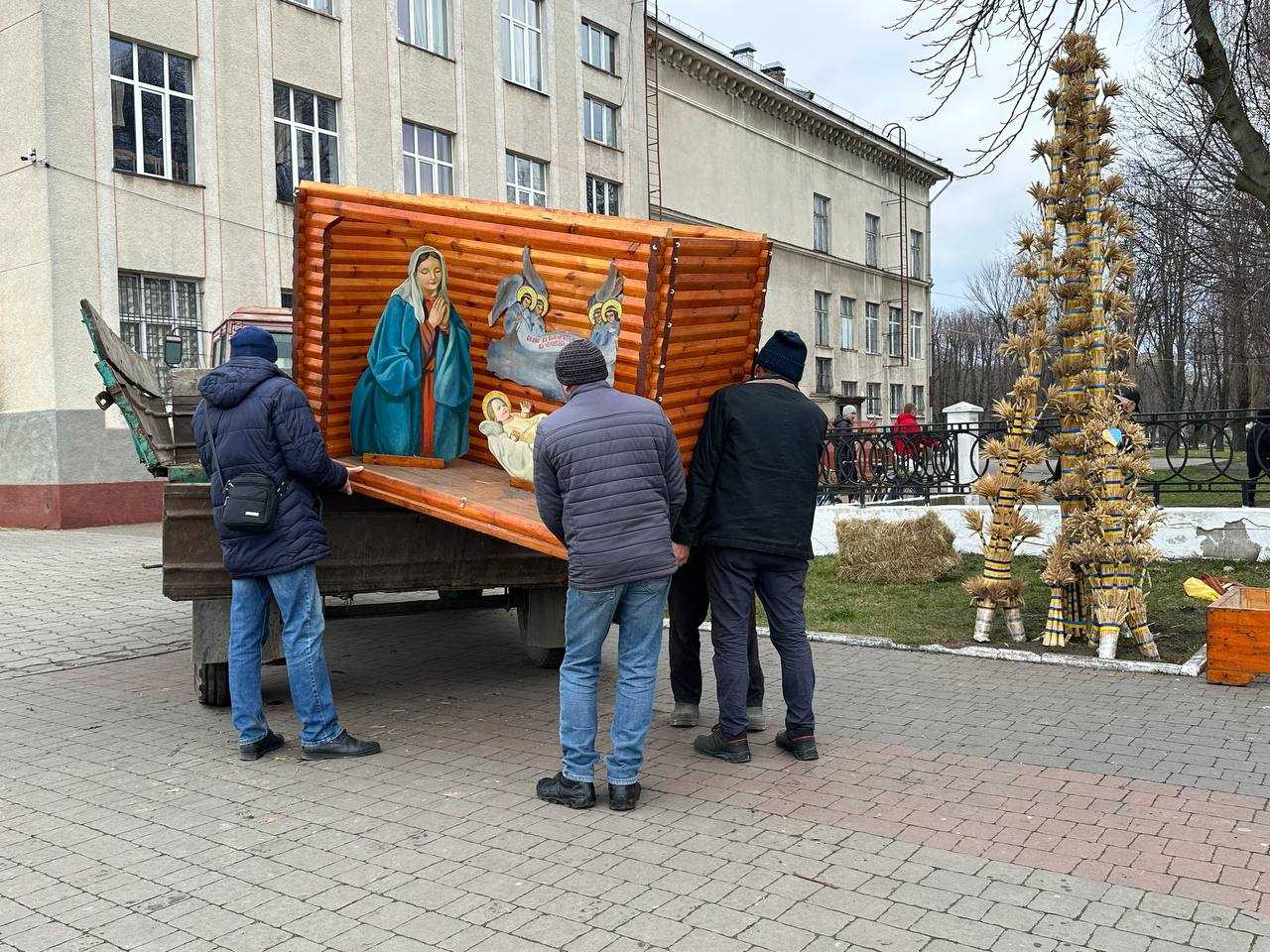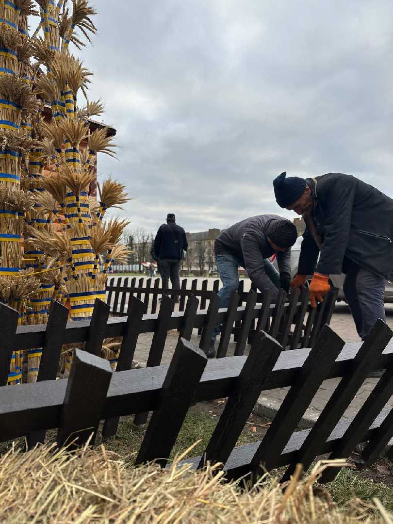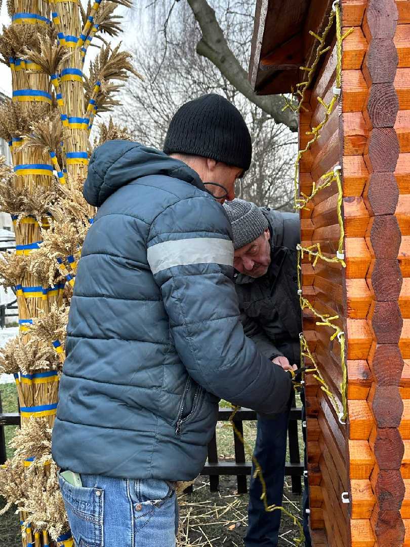 Комунальники змонтували різдвяну шопку, а поруч майстер Василь Герус завершив свою роботу над чотириметровим колосковим снопом.