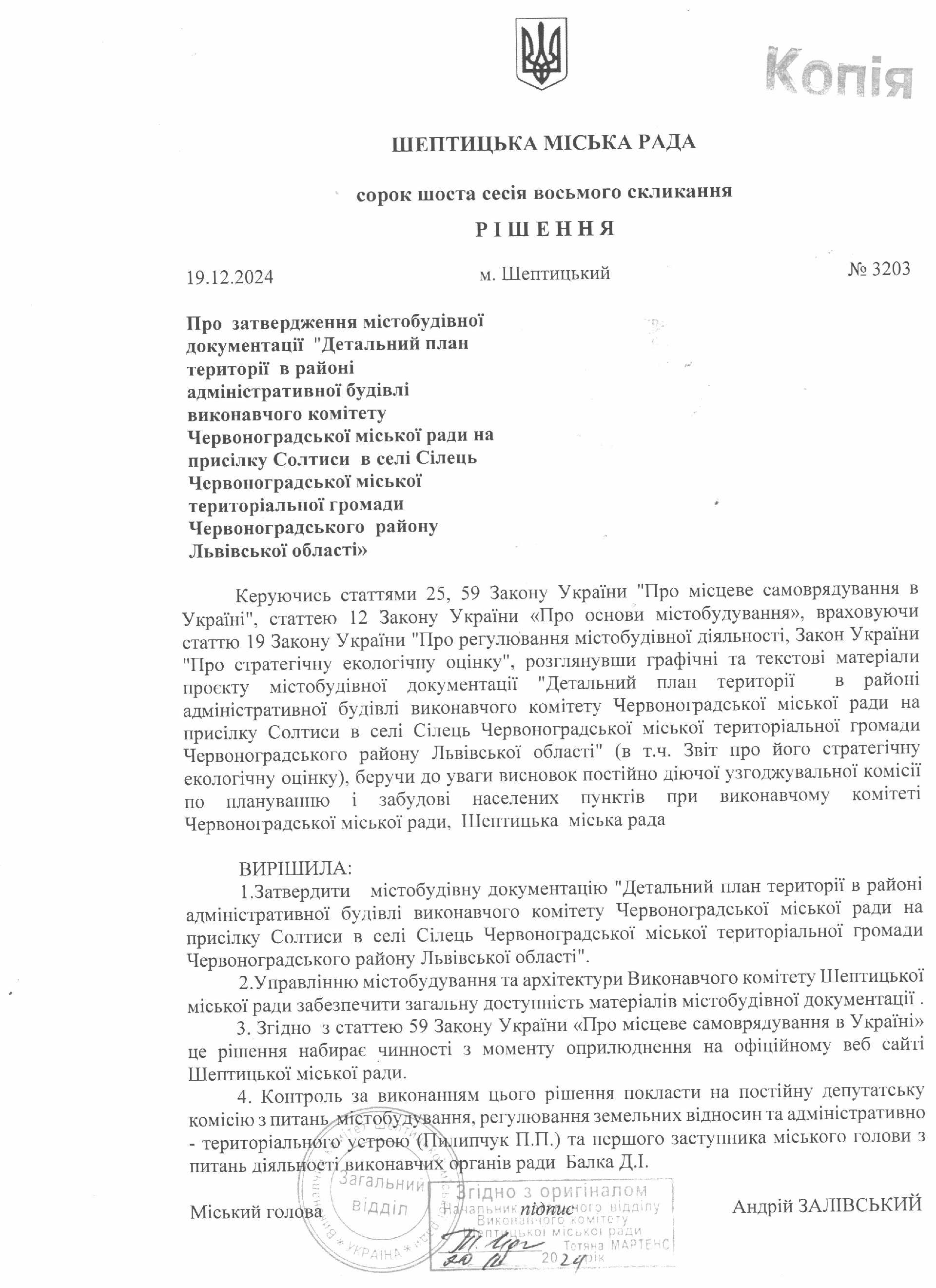 Детальний план території в районі адміністративної будівлі виконавчого комітету Червоноградської міської ради на присілку Солтиси в с. Сілець Червоноградської міської територіальної громади Червоноградського району Львівської області затверджено рішенням Шептицької міської ради від 19.12.2024 № 3203