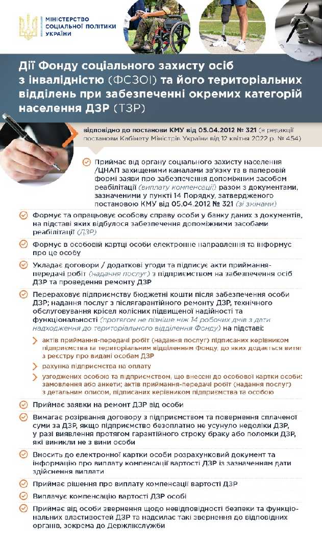 З 19 квітня 2022 року набрали чинності зміни, внесені до оновленого Порядку забезпечення допоміжними засобами реабілітації (технічними та іншими засобами реабілітації) осіб з інвалідністю, дітей з інвалідністю та інших окремих категорій населення і виплати грошової компенсації вартості за самостійно придбані такі засоби, затвердженого ПКМУ №321 від 05.04.2012р, якими передбачено механізм забезпечення допоміжними засобами реабілітації людей, постраждалих внаслідок війни Росії проти України, як військовослужбовців Збройних сил України та інших військових формувань, так і добровольців територіальної оборони, і мирних громадян.