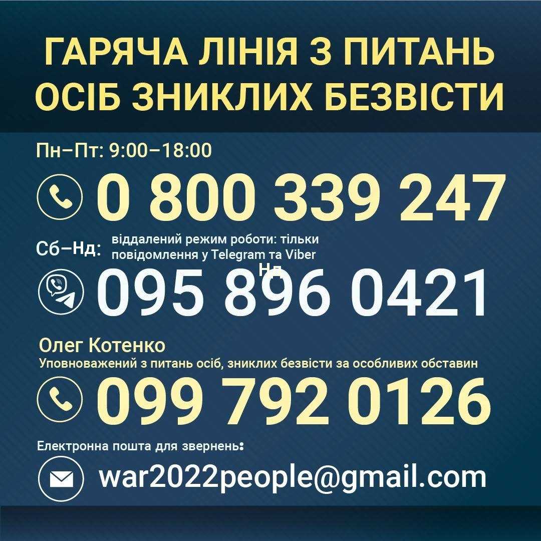 Уповноваженого Верховної Ради України з прав людини (адреса: 01008, м. Київ, вул. Інститутська, 21/8, електронна пошта: hotline@ombudsman.gov.ua, гаряча лінія: 044-253-75-89; 0800-50-17-20 (безкоштовно)), Міжнародного комітету Червоного Хреста (гаряча телефонна лінія, що приймає повідомлення про факти зникнення безвісти осіб: 0 800 300 155 ).