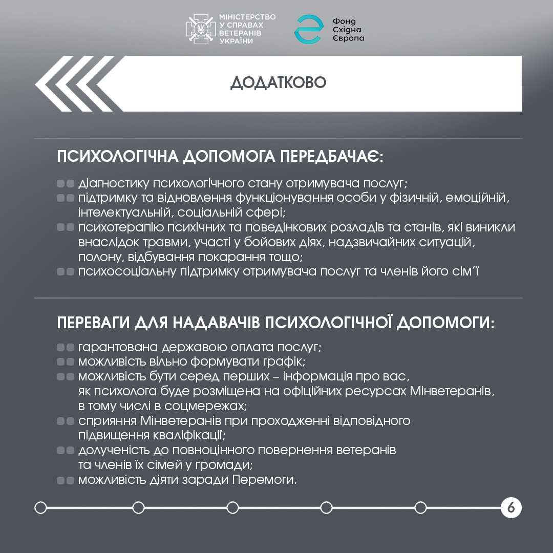 Цьогоріч в Україні впроваджується безоплатна психологічна допомога для ветеранів та їхніх родин. Мінветеранів відшкодовуватиме вартість наданих послуг спеціалізованим закладам різних форм власності, в тому числі й фізичним особам-підприємцям, які надають такі послуги з психологічної допомоги, зокрема за послуги: