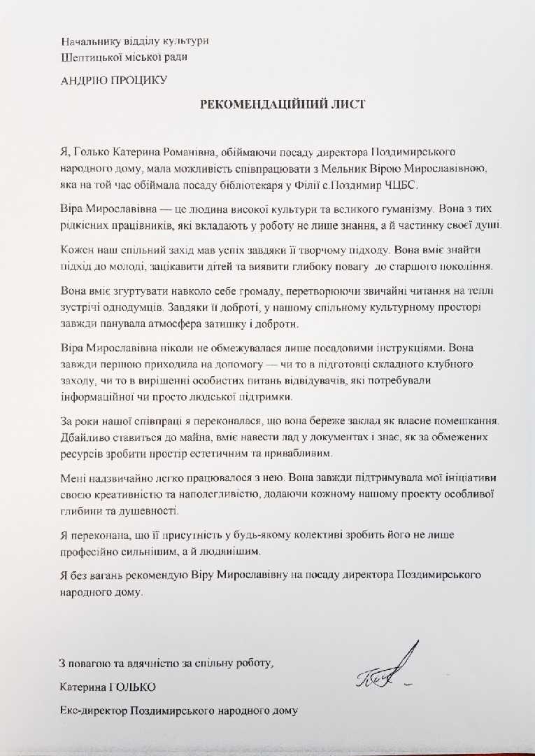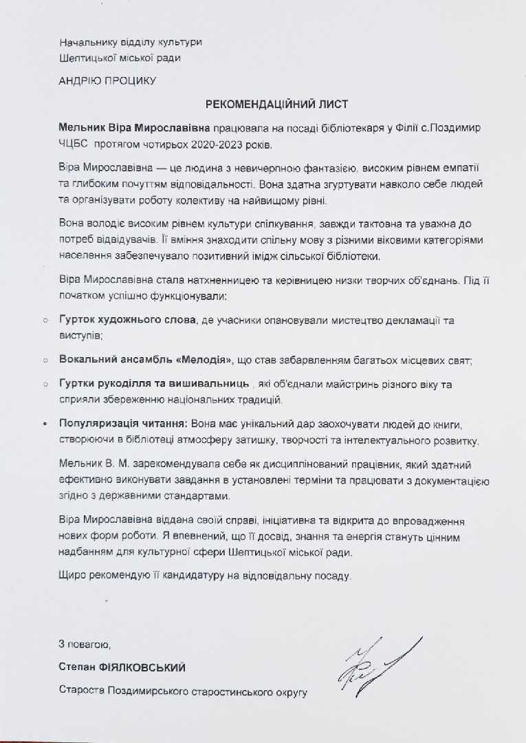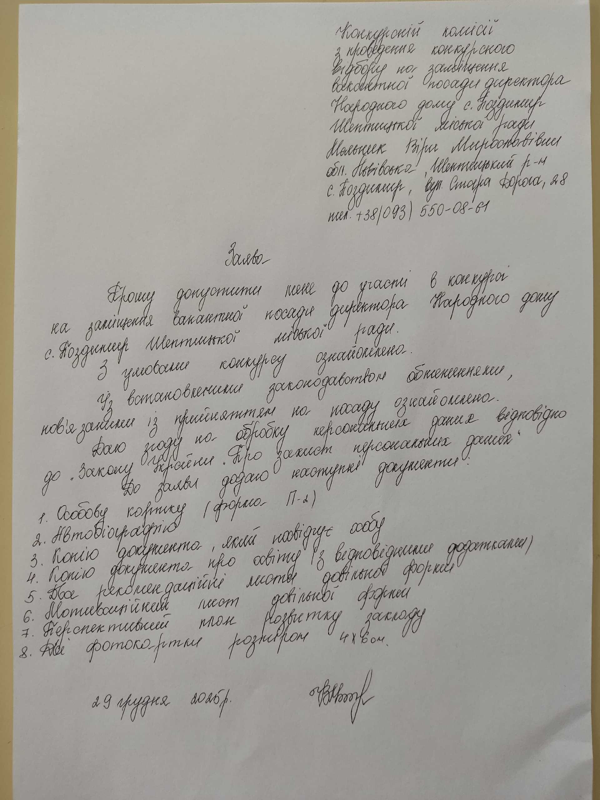 Відповідно до Закону України «Про внесення змін до деяких законодавчих актів України щодо запровадження контрактної форми роботи у сфері культури та конкурсної процедури призначення керівників державних та комунальних закладів культури» та Порядку призначення на посаду керівників закладів культури Червоноградської міської ради Львівської області за результатами конкурсного відбору, затвердженого рішенням сесії Червоноградської міської ради від 03.03.2016 №93, п.6.4 висвітлено подані документи претендента на посаду директора КЗ «Поздимирський народний дім» - Мельник Віри Мирославівни.