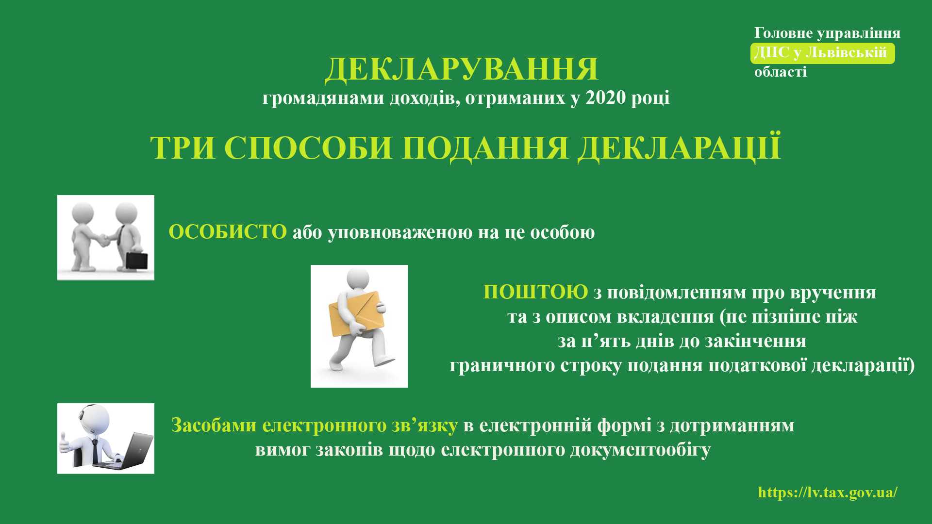 Червоноградська ДПІ ГУ ДПС у Львівській області нагадує, що триває кампанія декларування доходів громадян, отриманих у 2020 році. Річну податкову декларацію про доходи за минулий рік зобов’язані заповнити і подати до 1 травня 2021 року громадяни, котрі отримали доходи, з яких в минулому році не сплачено податок на доходи фізичних осіб.