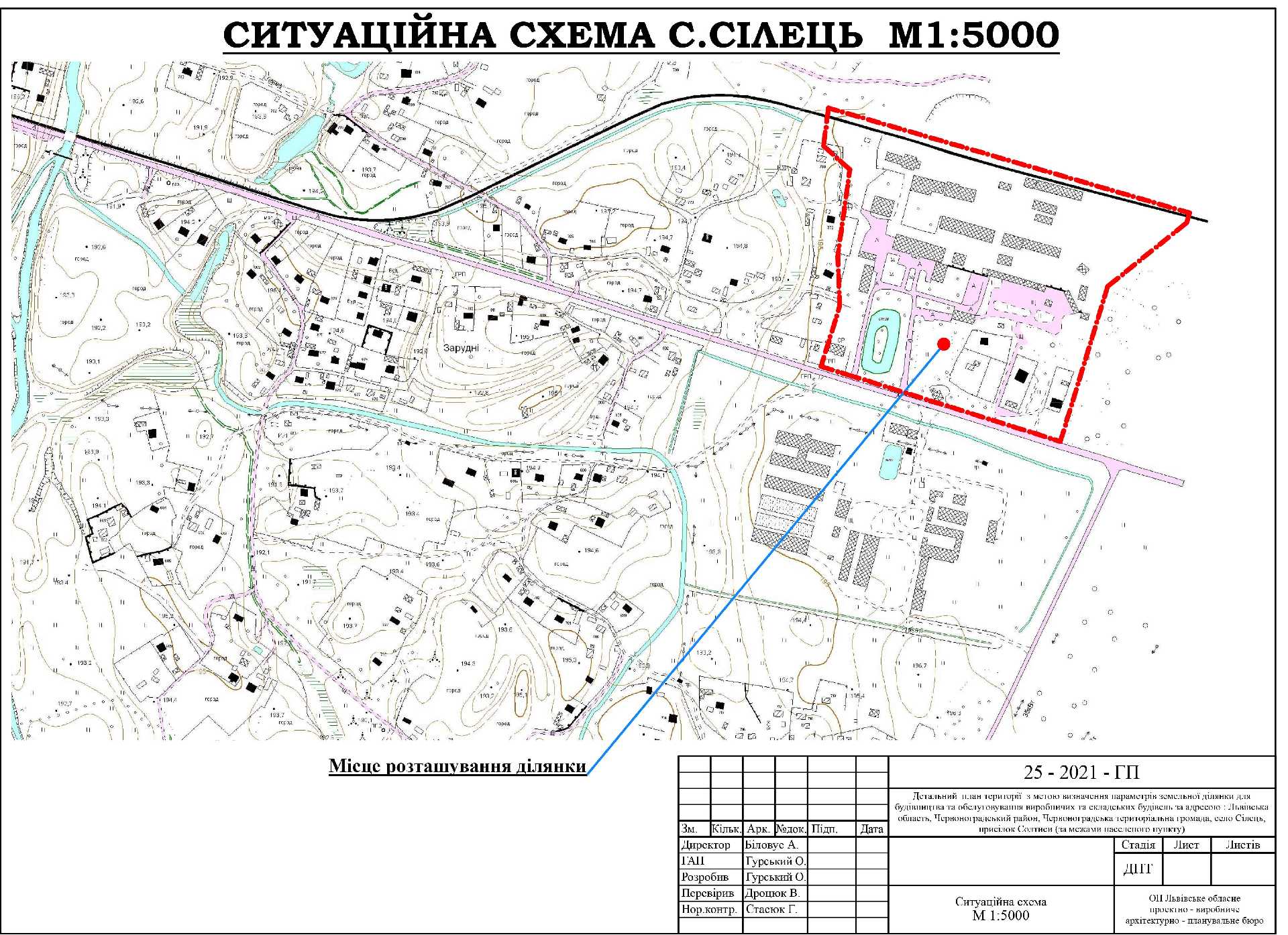 Проект містобудівної документації «Детальний план території з метою визначення параметрів земельної ділянки для будівництва та обслуговування виробничих та складських будівель за адресою : Львівська область Червоноградський район Червоноградська територіальна громада, село Сілець присілок Солтиси (за межами населеного пункту» виконаний Червоноградським відділом орендного підприємства Львівське обласне проектно - виробниче архітектурно-планувальне бюро» згідно розпорядження голови Сокальської райдержадміністрації від 14.05.2021 року № 15 .