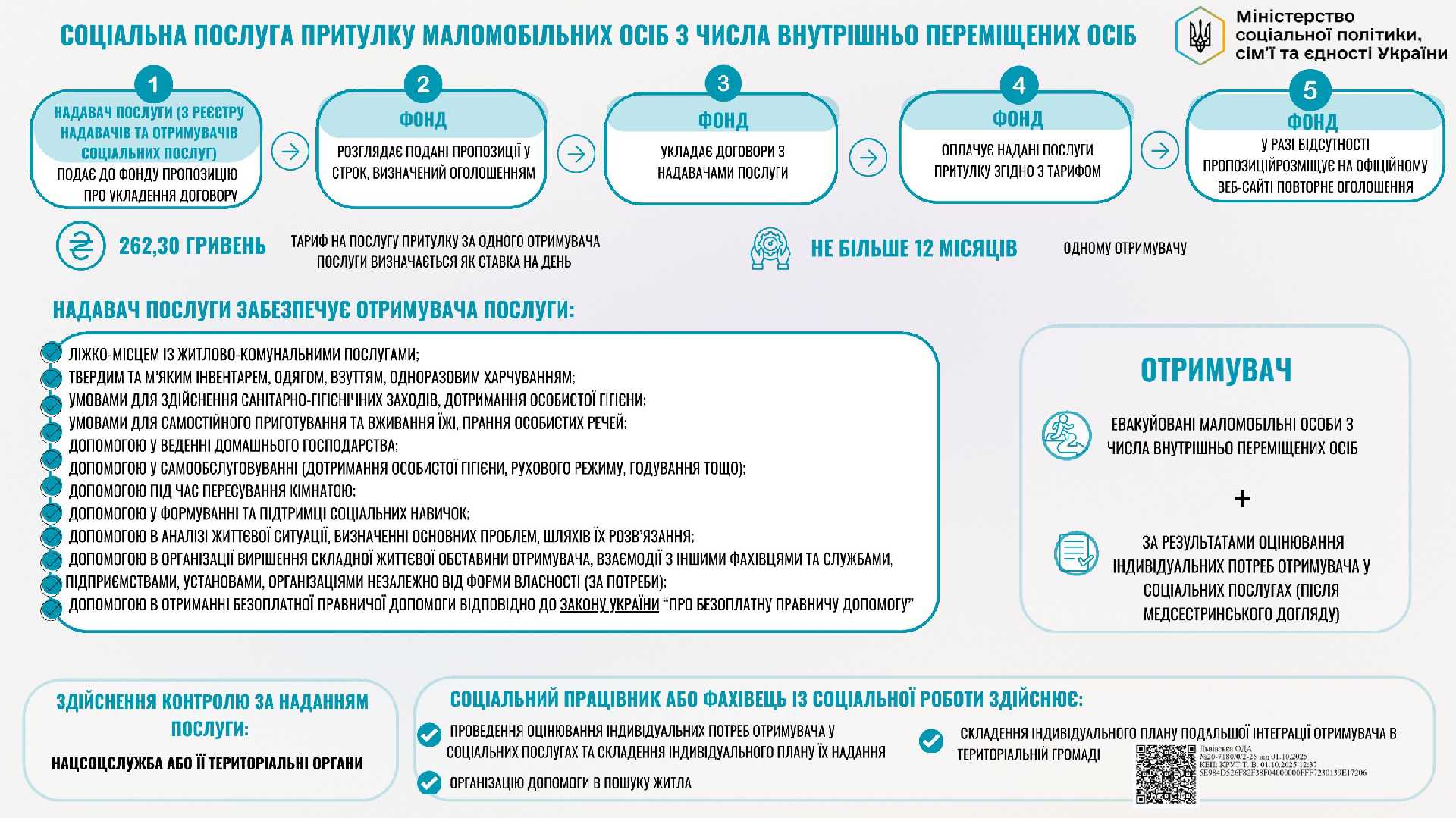 Розпочато новий експериментальний проект з надання соціальної послуги притулку маломобільним особам з числа ВПО. Йдеться про договірну форму надання послуги відповідно до постанови КМУ від 17.09.2025р. №1169.