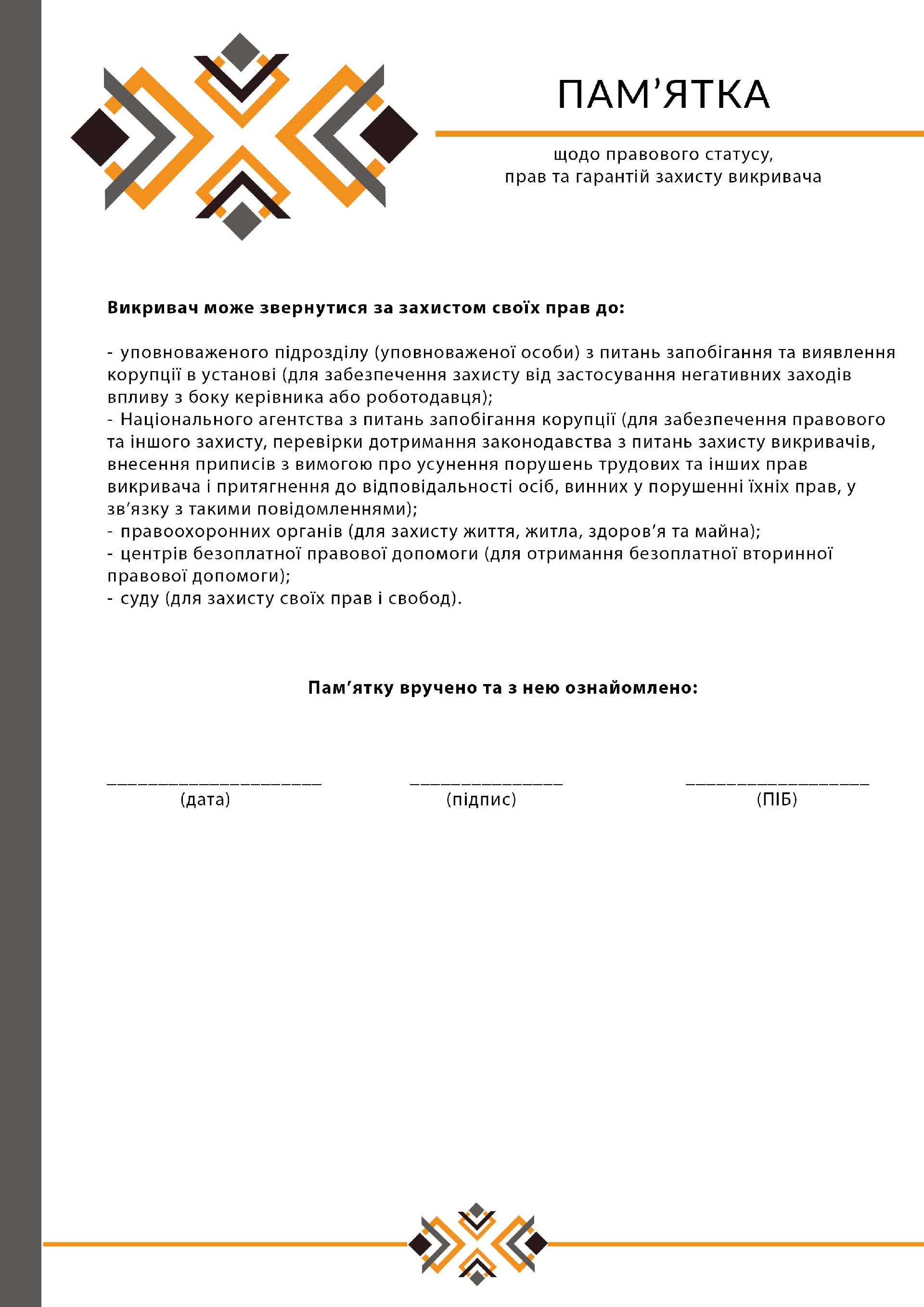 - Національного агентства з питань запобігання корупції (для забезпечення правового та іншого захисту, перевірки дотримання законодавства з питань захисту викривачів, внесення приписів з вимогою про усунення порушень трудових та інших прав викривача і притягнення до відповідальності осіб, винних у порушенні їхніх прав, у зв’язку з такими повідомленнями);