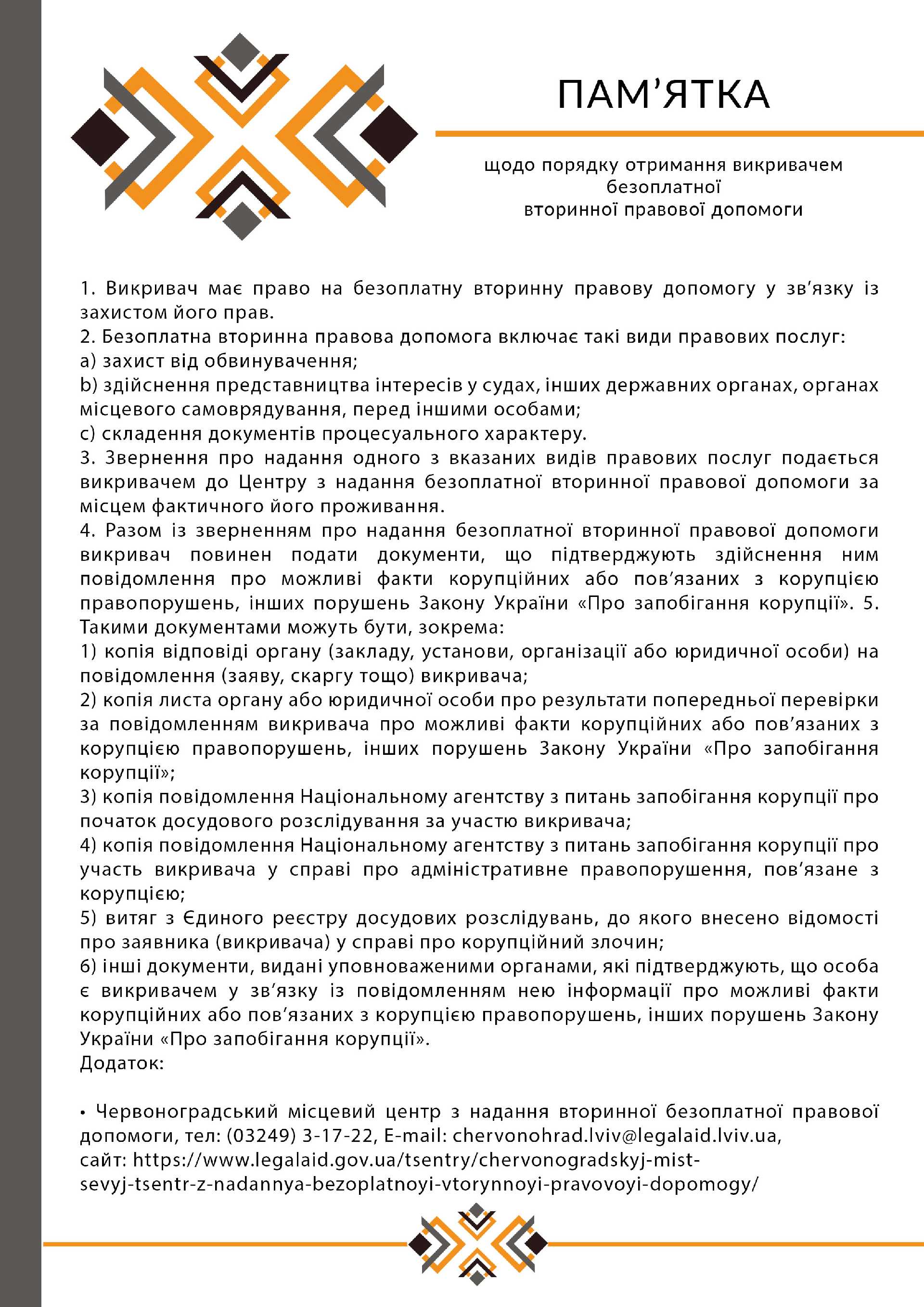 • Звернення про надання одного з вказаних видів правових послуг подається викривачем до Центру з надання безоплатної вторинної правової допомоги за місцем фактичного його проживання.