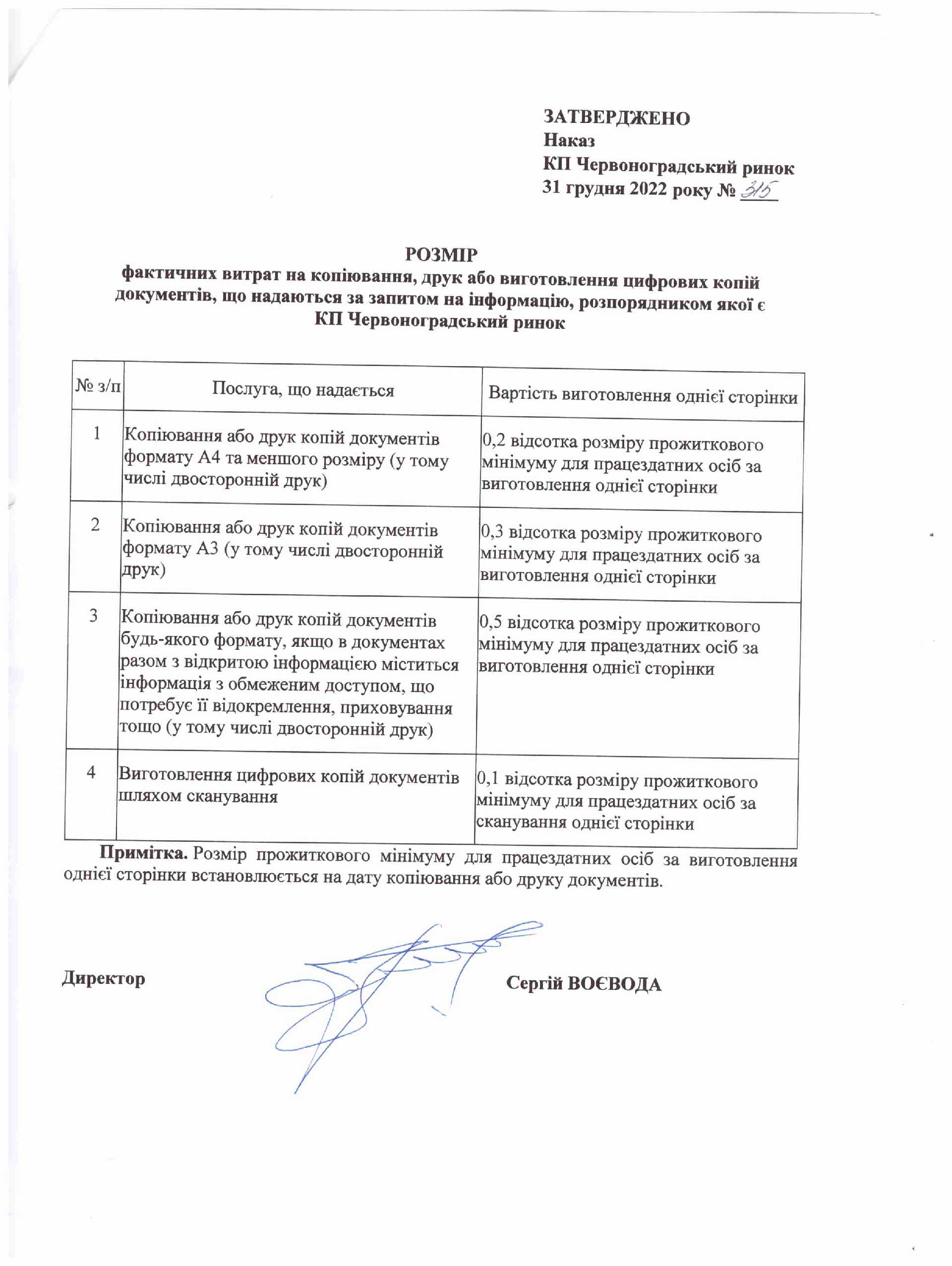 Наказ Про затвердження розміру фактичних витрат на копіювання, друк або виготовлення цифрових копій документів, що надаються за запитом на інформацію, розпорядником якої є КП Червоноградський ринок