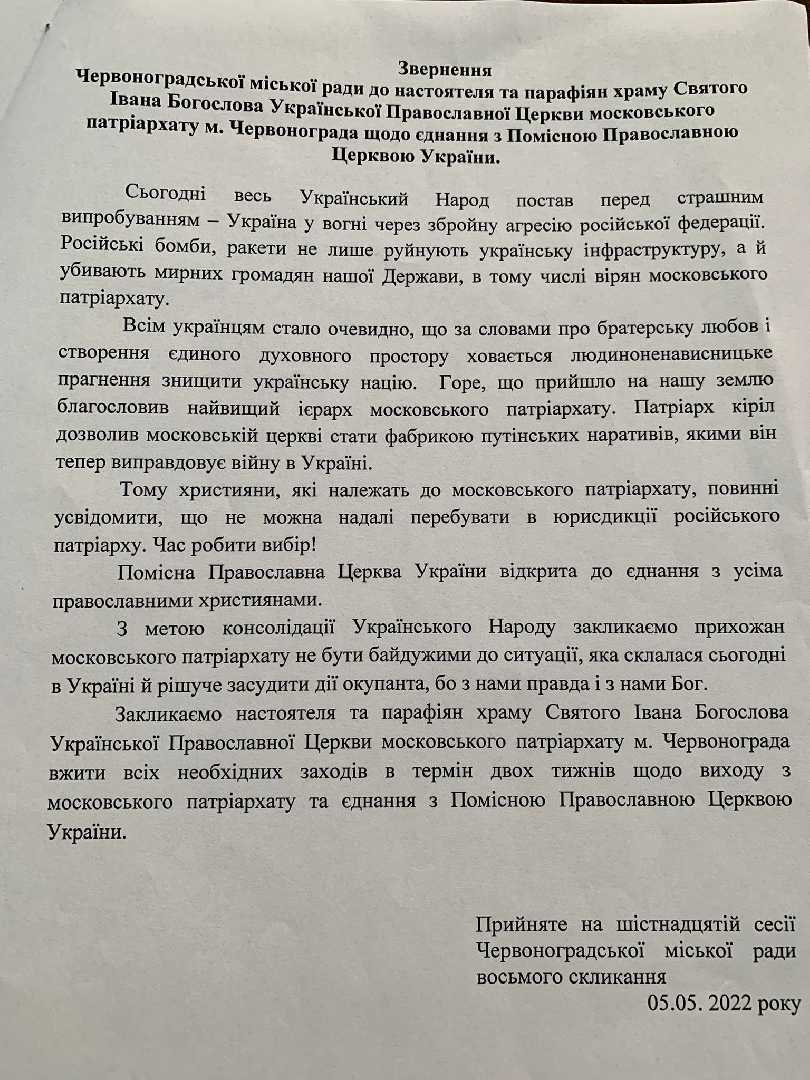 Зокрема, у зверненні йдеться про те, що «з метою консолідації Українського Народу закликаємо прихожан московського патріархату не бути байдужими до ситуації, яка склалася сьогодні в Україні й рішуче засудити дії окупанта, бо з нами правда і з нами Бог. Закликаємо настоятеля та парафіян храму святого Івана Богослова Української Православної Церкви московського патріархату м. Червоноград вжити всіх необхідних заходів в термін двох тижнів щодо виходу з московського патріархату та єднання з Помісною Православною Церквою України».