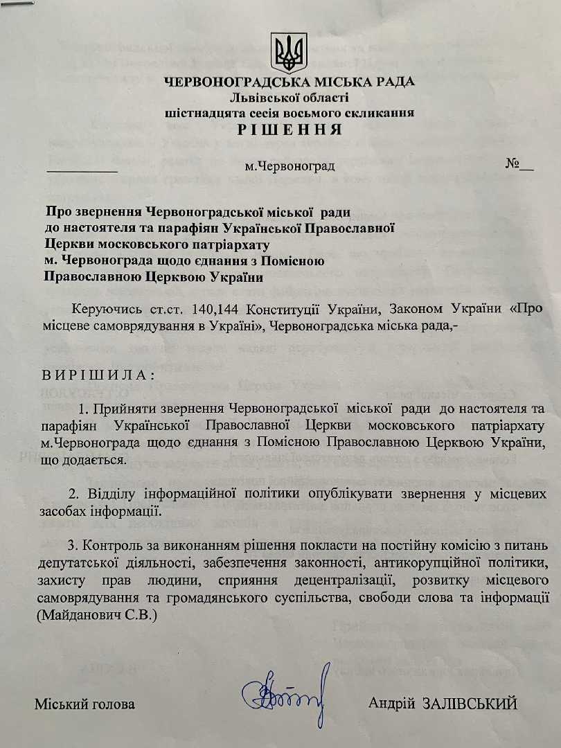 Сьогодні, 5 травня, під час засідання сесії депутати підтримали звернення Червоноградської міської ради до настоятеля та парафіян Української Православної Церкви московського патріархату Червонограда щодо єднання з Помісною Православною Церквою України.