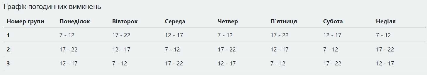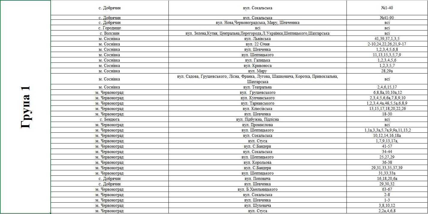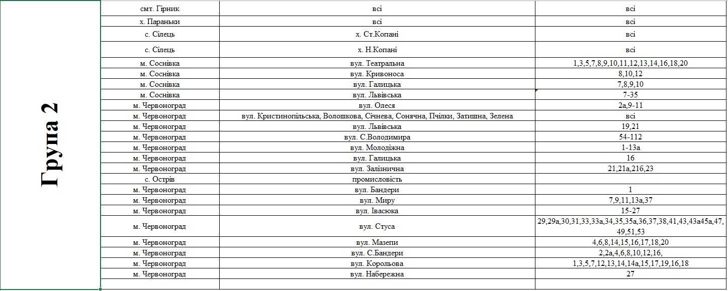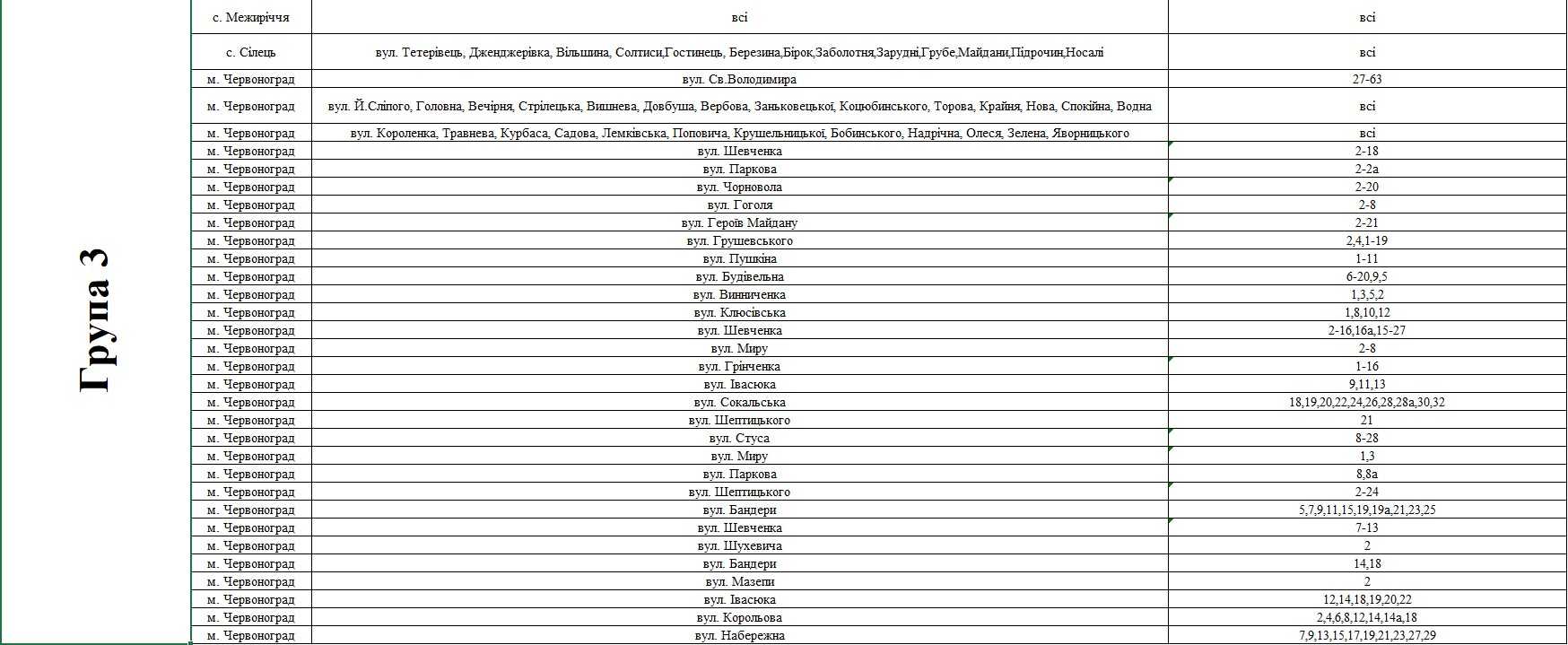 Відкриваємо фото і шукаємо власну вулицю. На фото у першому стовпчику - номер групи. Відтак, дізнавшись у якій групі ваш будинок, дивимось фото з графіком, де вказані години.
