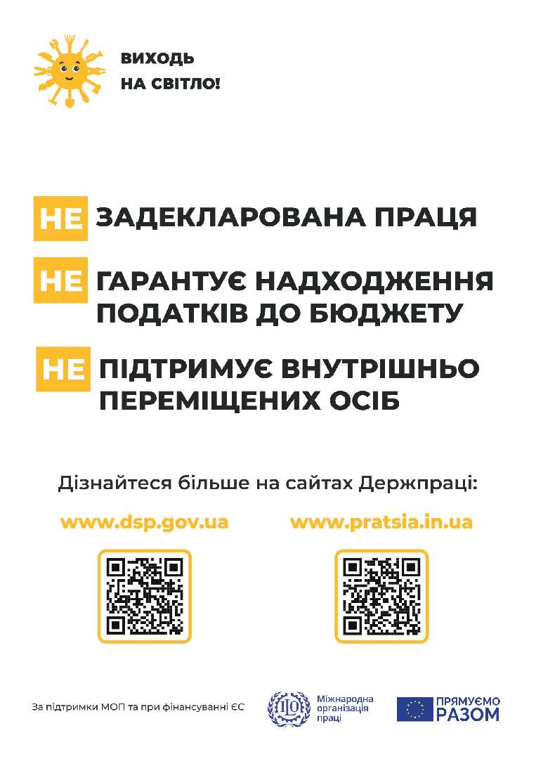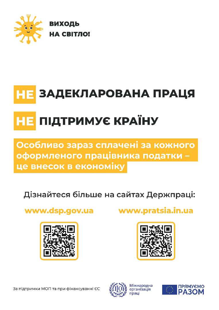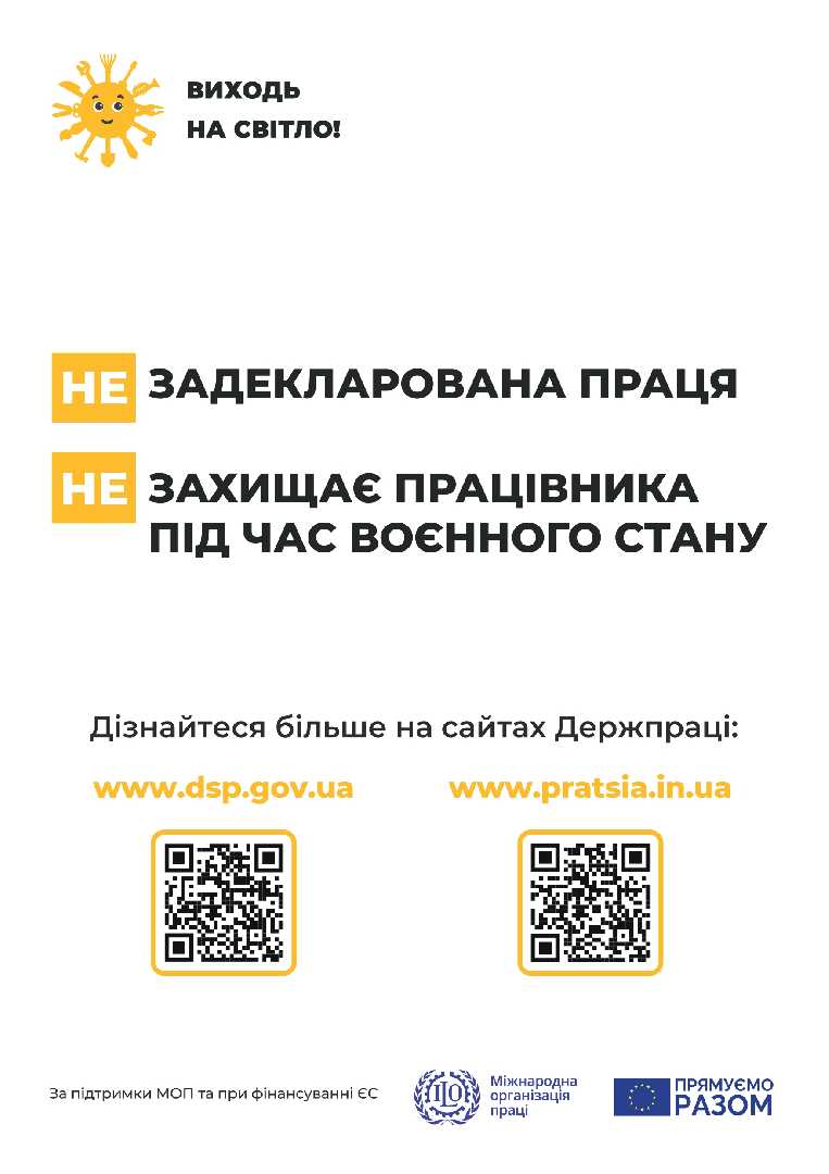 В Україні триває інформаційна кампанія Державної служби України «Виходь на світло!». Проєкт має на меті інформувати роботодавців та працівників про вимоги законодавства, що стосуються оформлення трудових відносин, та моніторингу стану його дотримання.