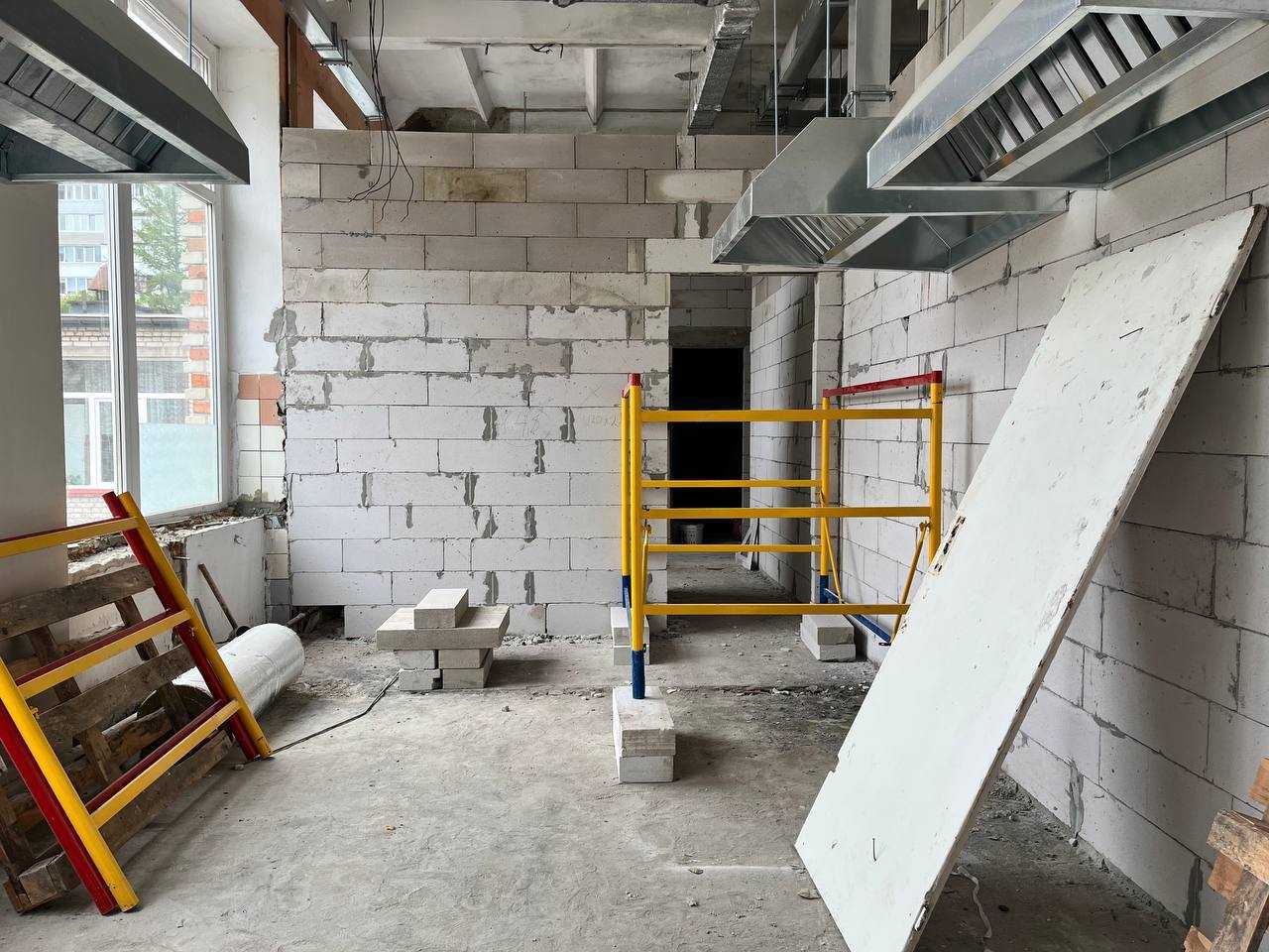 Минулого тижня підрядна організація ТОВ «Захід Фемелі Груп» розпочала ремонтні роботи у харчоблоці Гімназії імені родини Луговських. Наразі там триває мурування нових внутрішніх перегородок відповідно до внесених змін у проєкт: