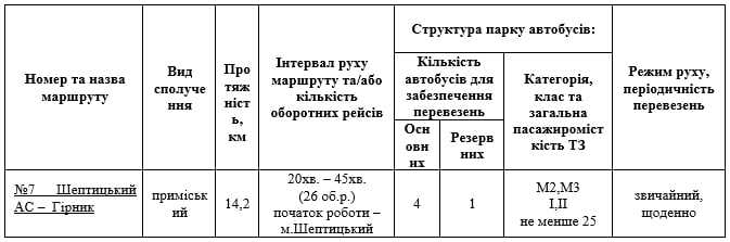 З метою забезпечення перевезення пасажирів по маршруту №7 Шептицький АС – Гірник Виконавчий комітет Шептицької міської ради оголошує пошук автомобільного перевізника для тимчасового обслуговування маршруту, до моменту визначення автомобільного перевізника на конкурсних засадах.