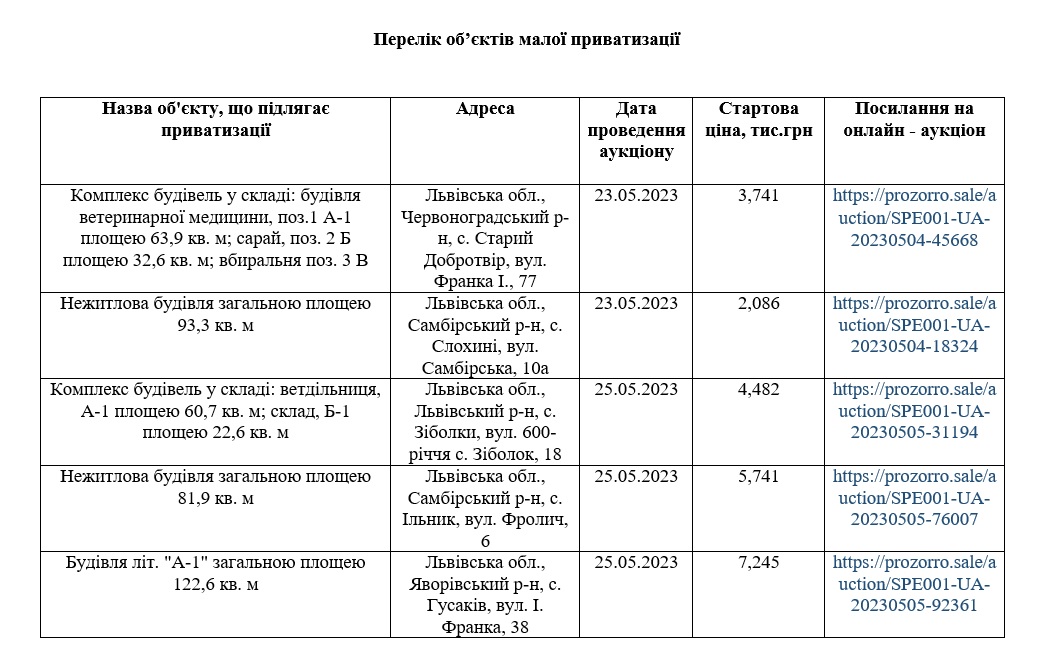 Регіональне відділення Фонду державного майна України у Львівській області у травні 2023 року проводить онлайн – аукціони з приватизації державного майна.