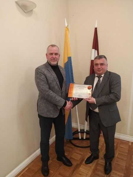 ???????????????????? На знак вдячності за допомогу Червоноградські рятувальники Олексій Скрібенець та Роман Кіс разом із заступником міського голови Volodymyr Koval відвідали благодійників у місті Валмієра та вручили міському голові Jānis Baiks відзнаку «Благодійник громади», а Dzintars Robulis медаль «Волонтер України».