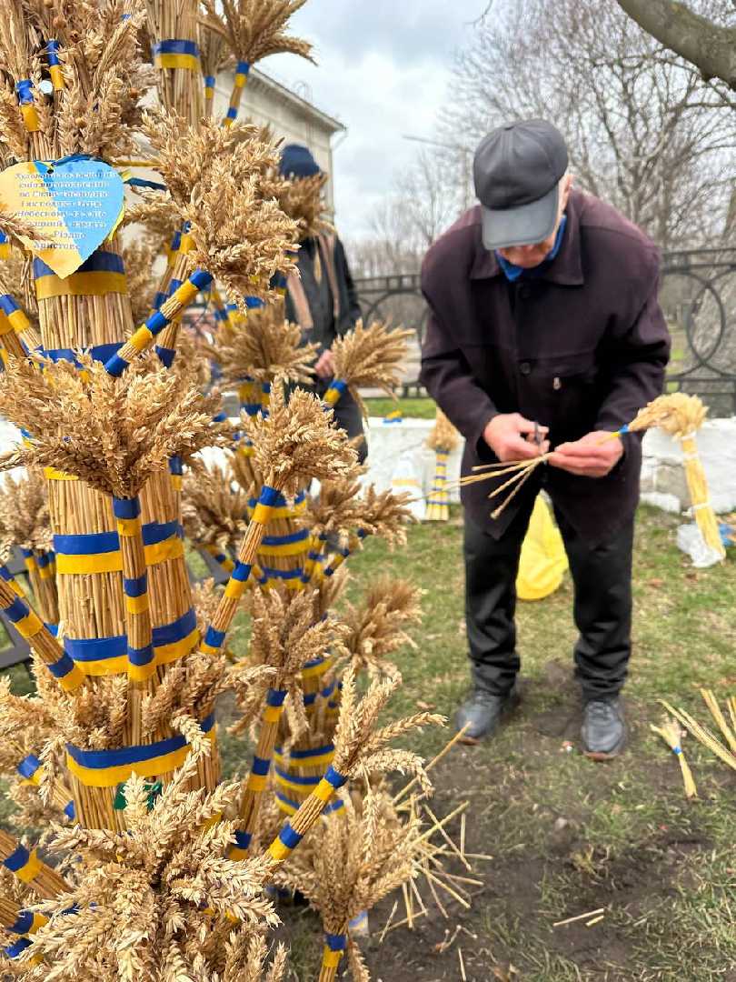 Комунальники змонтували різдвяну шопку, а поруч майстер Василь Герус завершив свою роботу над чотириметровим колосковим снопом.