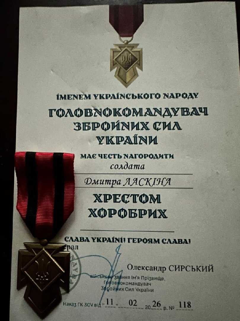 Наш земляк, Дмитро Ласкін, відзначений почесним нагрудним знаком «Хрест хоробрих» від Головнокомандувача Збройних Сил України.