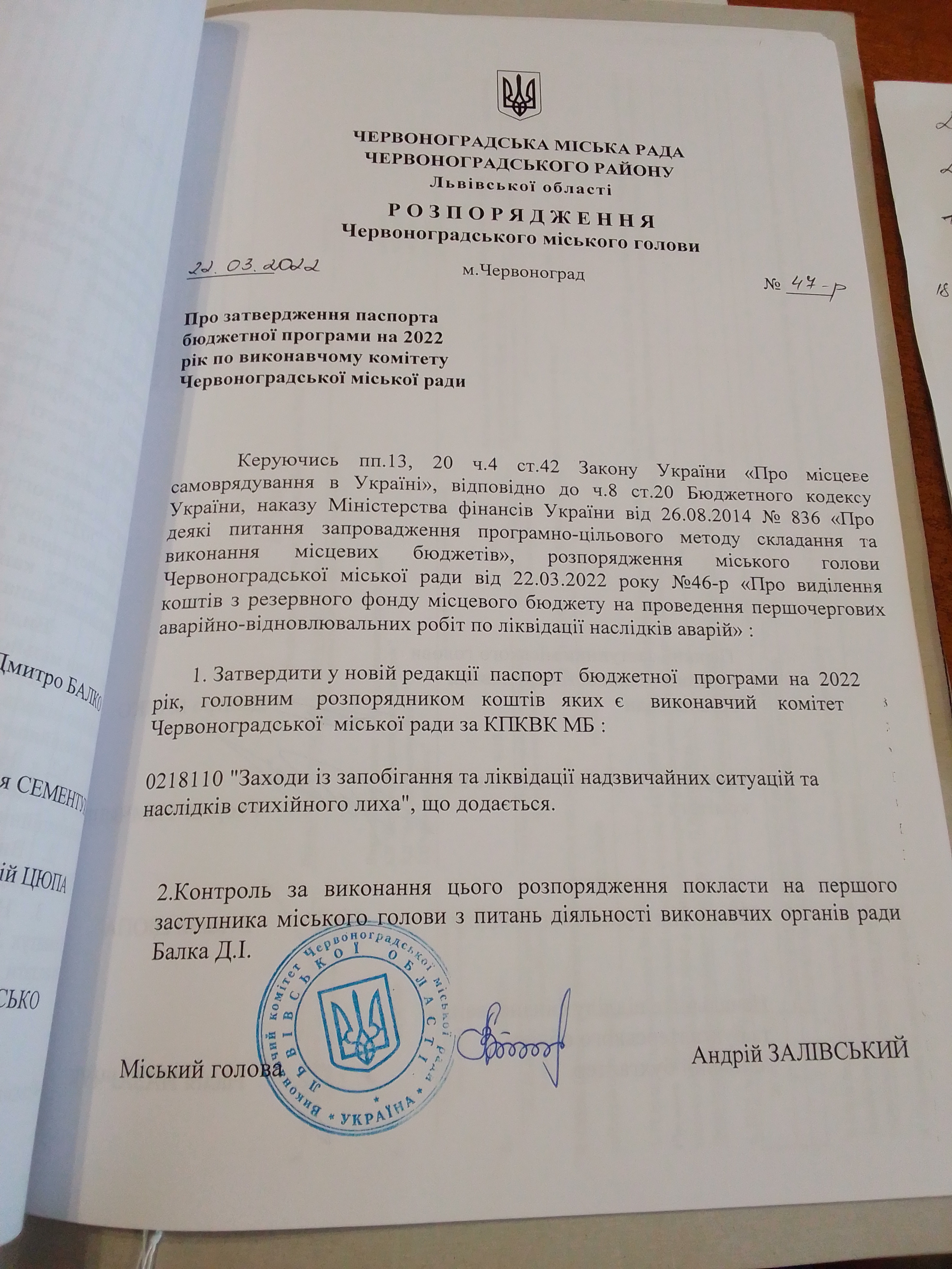 | Номер розпорядження | 47 |