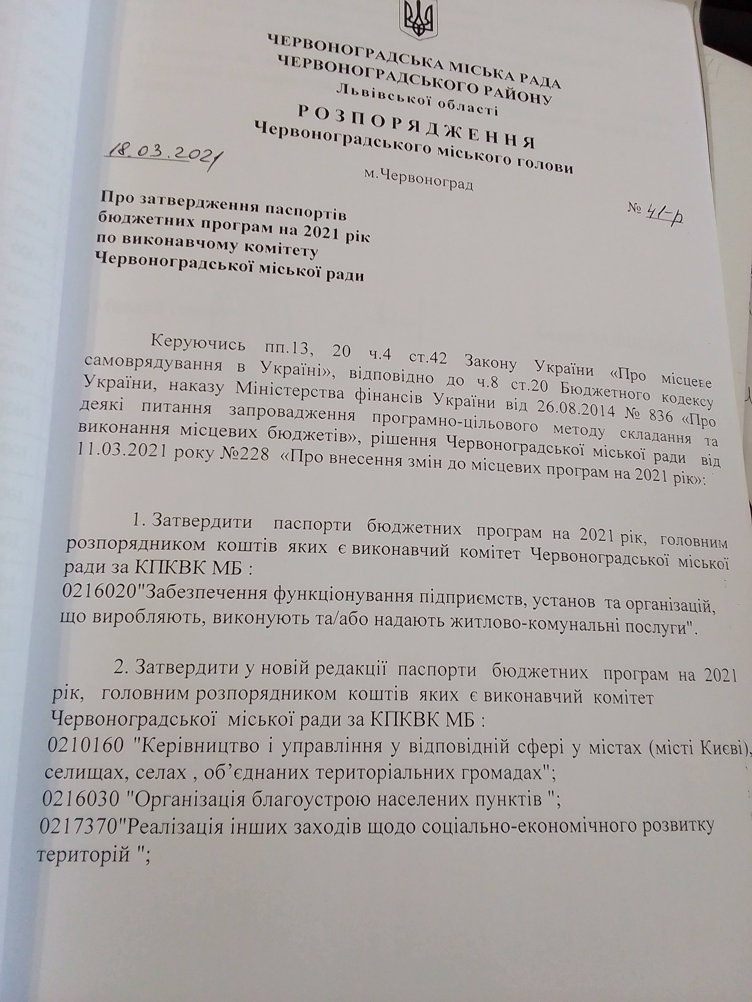 | Номер розпорядження | 41 |